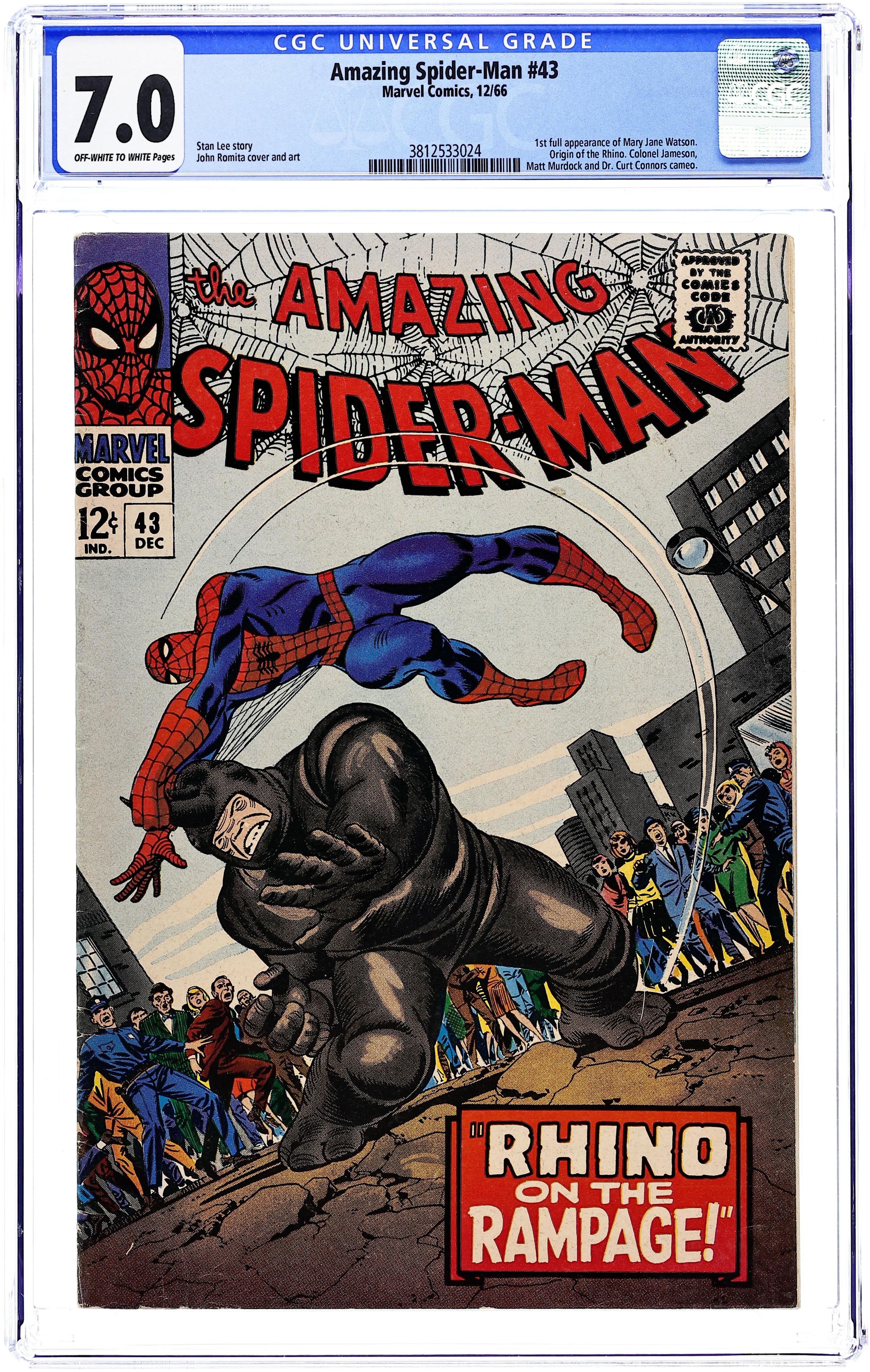 1st full appearance of Mary Jane (cameos in #25,38, & 42). Cover by John Romita Sr.. MJ has her first in-depth interaction with Peter Parker, plus cameos by Foggy Nelson and Matt Murdock (Daredevil) in Rhino on the Rampage!, script by Stan Lee, art by John Romita Sr.; Rhino escapes from police custody and is looking for revenge on Spider-Man for defeating his attempt to kidnap John Jameson. Reprinted in Marvel Tales # 32 and 183. 36 pgs., full color. $0.12. Cover price $0.12.