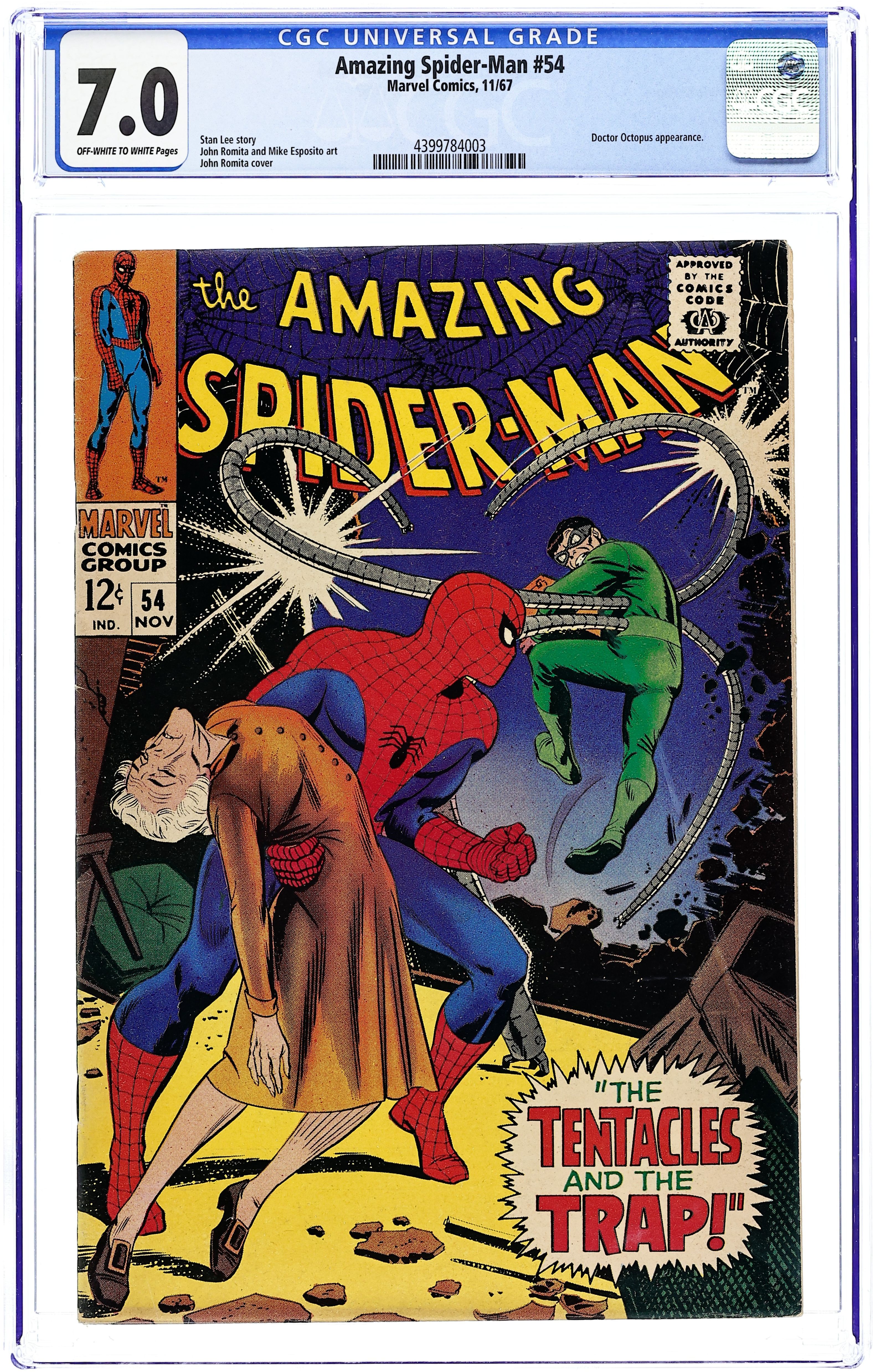 Cover by John Romita Sr. The Tentacles and the Trap!, script by Stan Lee, pencils by John Romita, inks by Mike Esposito (as Mickey Demeo); Spider-Man faces off against Doctor Octopus on the lawn of the Parker house; With Aunt May caught in the crossfire, ol' Webhead will have to think fast if he wants to save her. Reprinted in Marvel Tales # 39. 36 pgs., full color. $0.12. Cover price $0.12.