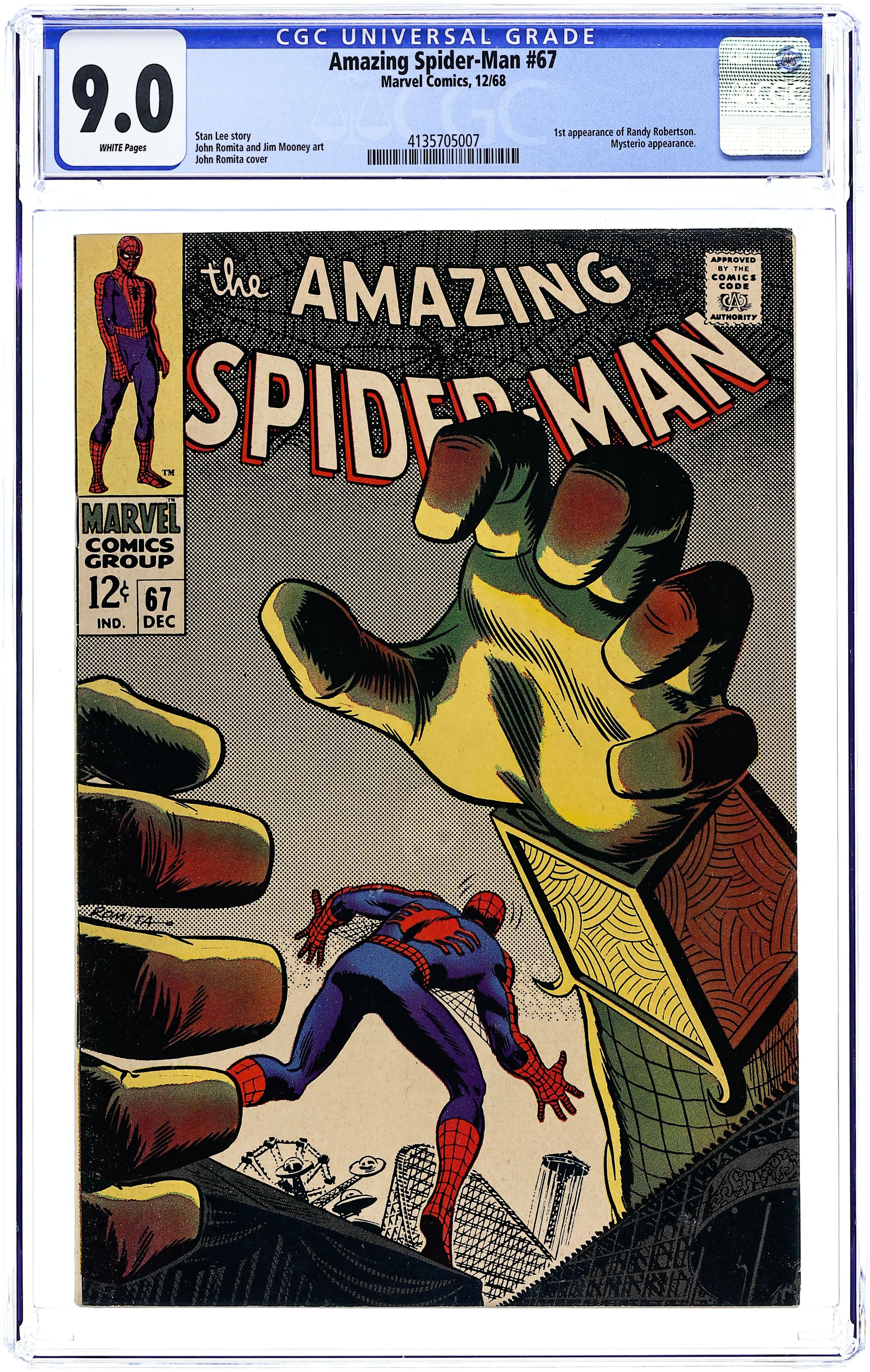 First appearance of Randy Robertson in "To Squash a Spider!" Part 2 of 2. Script by Stan Lee. Pencils by John Romita. Inks by Jim Mooney. Cover by John Romita. In unbelievable fashion, Mysterio has shrunk the web-slinger to just six inches tall...and thrown him into a giant amusement park! Spider-Man attempts to get his bearings, but when he enters the house of mirrors -- everything goes haywire! However the web-spinner has fought Mysterio a few times before. And he knows if he can see through the illusions -- the path to triumph will be revealed! Will your friendly neighborhood Spider-Man find the pathway in time? Cameo appearances by Aunt May, Anna Watson, J. Jonah Jameson, Joe Robertson, Betty Brant, and Ned Leeds. (Notes: The original Mysterio does not return until a decade later -- in the storyline leading up to Amazing Spider-Man 200. This issue was reprinted in Marvel Tales #50.) 32 pages. Cover price $0.12.
