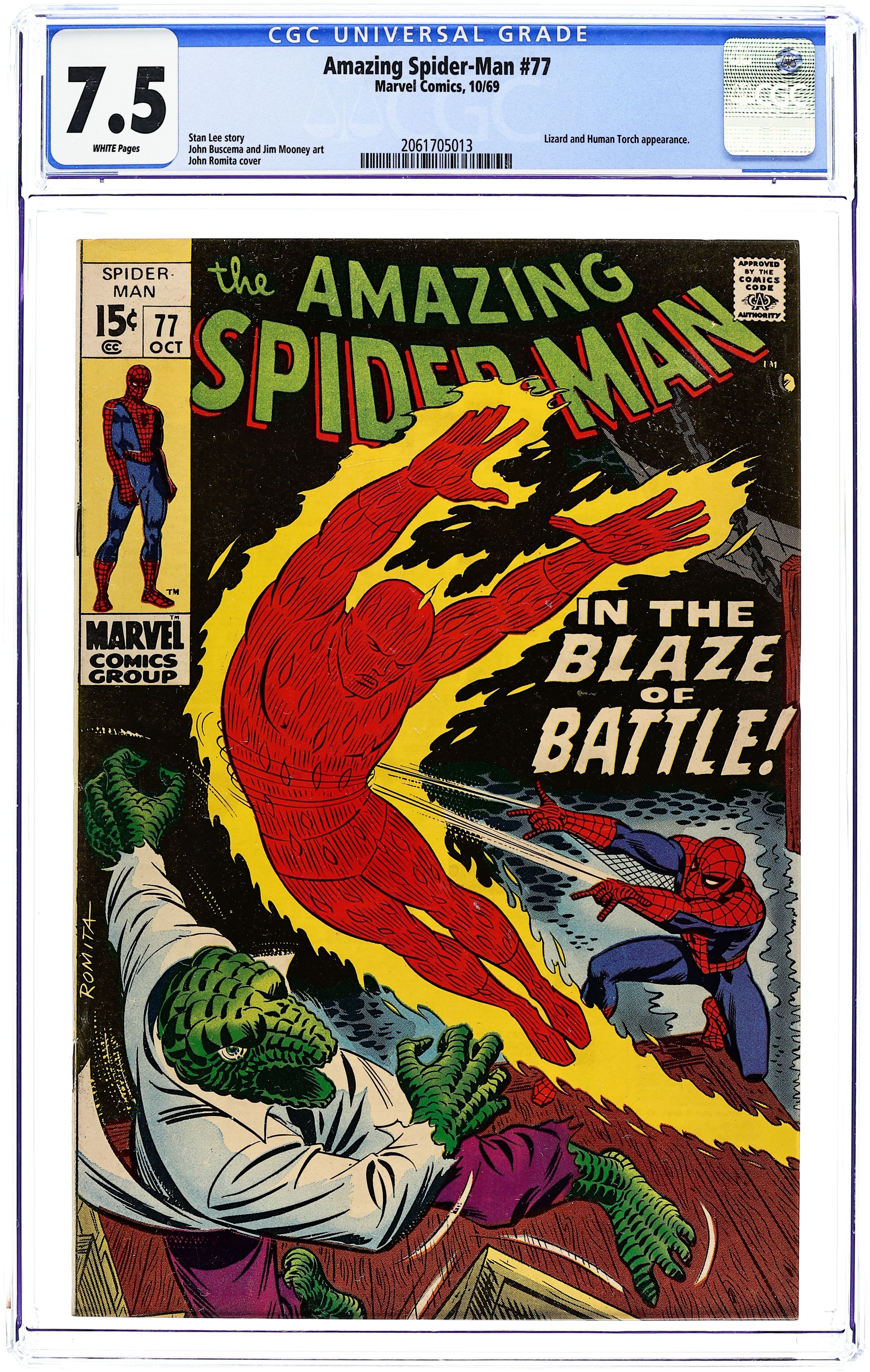 "In the Blaze of Battle!" Part 2 of 2. Guest-starring the Human Torch. Plot by John Buscema. Script by Stan Lee. Art by John Buscema (layouts) and Jim Mooney (finishes). Cover by John Romita. In the nick of time, the Human Torch arrives to interrupt the Lizard's attack! The web-slingershould be overjoyed, but he's not! Because Johnny Storm might accidentally hurt the Lizard during the fight. So as a result a confusing three-way battle takes place across the city! The Human Torch vs. the Lizard; Spider-Man vs. the Human Torch; and the Lizard vs. Spider-Man! How can thewall-crawler make sure everyone walks away a winner? Appearances by Billy Connors and Martha Connors. (Notes: Spider-Man tangles with the Lizard again in Amazing Spider-Man 102. The letters page includes a letter from comics writer Don McGregor. This issue was reprinted in Marvel Tales #58.) 36 pages. Cover price $0.15.