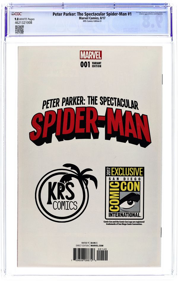 San Diego Comic Con KRS Retailer Exclusive Variant. Written by Chip Zdarsky. Art by Adam Kubert. Cover by Stanley "Artgerm" Lau. SPIDER-MAN RETURNS TO THE FRIENDLY NEIGHBORHOOD! The webslinging, wallcrawling wonder returns to New York City in the all-new PETER PARKER: THE SPECTACULAR SPIDER-MAN. A companion series to the best-selling Amazing Spider-Man series, Peter Parker is going back-to-basics for big heroics in the Big Apple. Featuring adversaries old and new, be there as Spider-Man returns to his friendly neighborhood for his never ending battle against crime and the dreaded 'Parker Luck'. 36 pages, full color. Rated T Cover price $4.99.