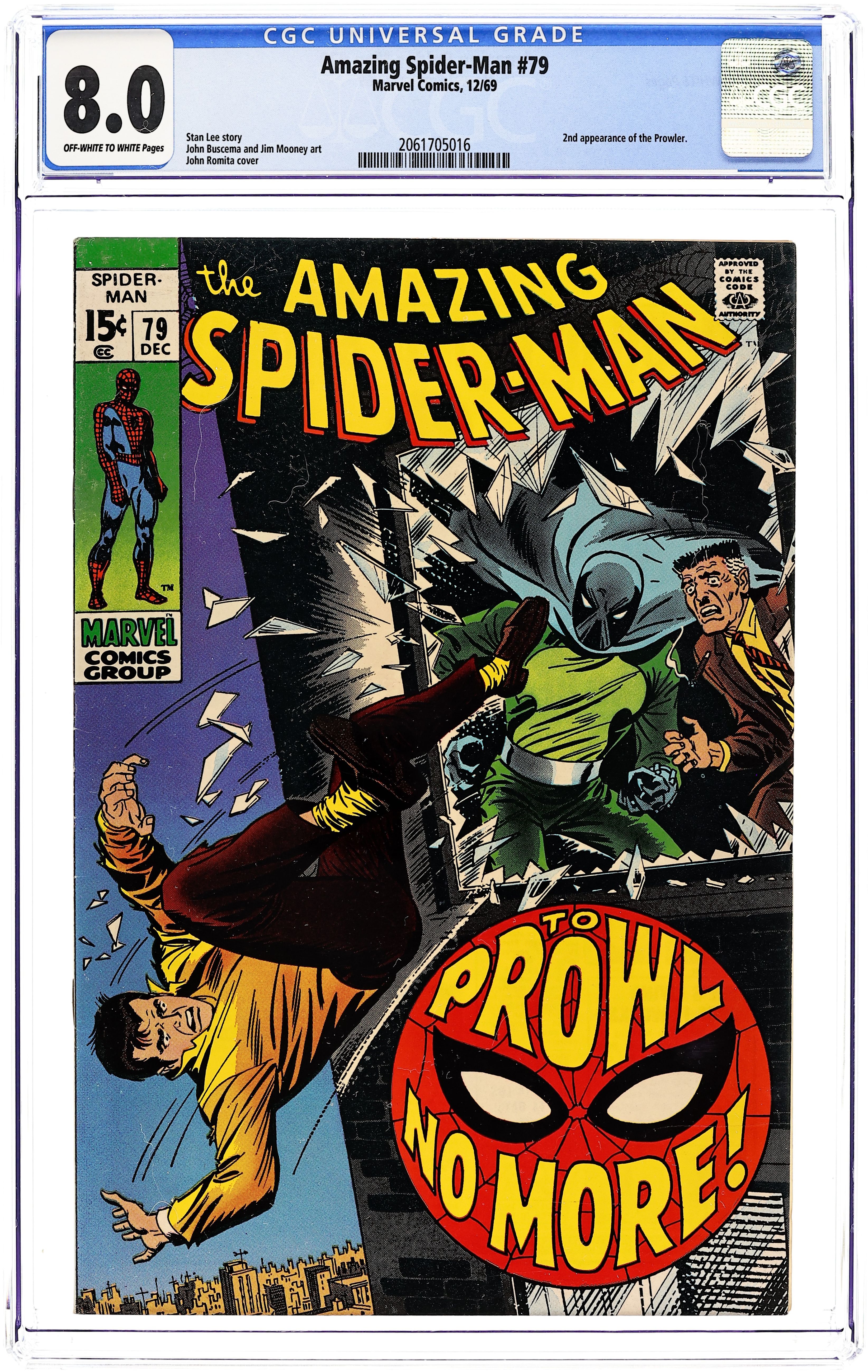 "To Prowl No More!" Part 2 of 2. Script by Stan Lee. Art by John Buscema (layouts) and Jim Mooney (finishes). Cover by John Romita. As shown on the frightening cover, Peter Parker falls out of J. Jonah Jameson's office window! But thanks to his ability to cling to surfaces...he survives! And after changing into his costume, Spider-Man welcomes the Prowler to the superhero vs. super-villain business! However during their fight, the web-slinger realizes that he and the Prowler have a lot in common. Perhaps there is a better way to resolve their conflict...and give Hobie Brown a fresh start. Cameo appearances by Gwen Stacy, J. Jonah Jameson, and Joe Robertson. (Notes: The Prowler returns in Amazing Spider-Man #87. This story was reprinted in Marvel Tales #60.) 36 pages. Cover price $0.15.