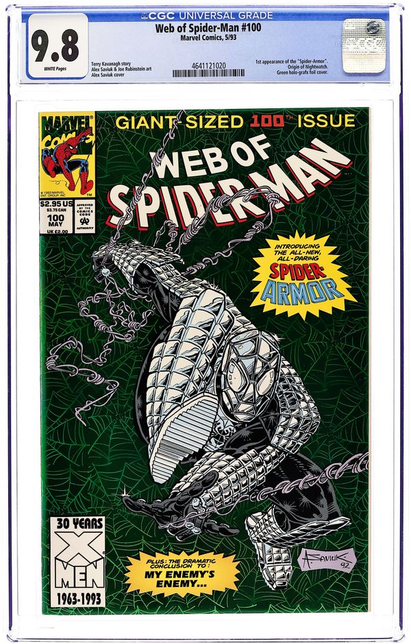 Direct Edition. "Uneasy Alliances" Part 4 of 4. Giant-Sized Anniversary Issue. Script by Terry Kavanagh. Pencils by Alex Saviuk. Inks by Joe Rubinstein. Green foil cover by Alex Saviuk. It's the 100th issue of the Web of Spider-Man series! And all roads (to take over the Kingpin's crime syndicate) lead to a mysterious estate on the outskirts of Manhattan! The Blood Rose is there! And so are the New Enforcers: Blitz, Eel, Tangle, Plantman, and Thermite! Along with the Dragon Man, Dreadnaught, and Super-Adaptoid! But before Peter Parker arrives, he decides to add something new to his usual red-and-blue ensemble…the Spider-Armor! Great idea! Because the web-slinger is going to need it when he battles no less than five super-villains and two Richard Fisks! With a little help from Nightwatch, the Amazing Spider-Man may turn the Spider-Armor's debut into a smashing success! It's every man for himself in the wild conclusion to the My Enemy's Enemy storyline! First appearance of the Spider-Armor. Cameo appearances by the Controller, Fixer, Mentallo, and Mr. Fear. Second story: "The Origin of Nightwatch" Script by Terry Kavanagh. Pencils and Inks by Derek Yaniger. The tragic story of how Dr. Kevin Trench became Nightwatch is revealed. (Notes: The issue provides new details about the Name of the Rose storyline that took place in Web of Spider-Man 84-89. Nightwatch appears next in Web of Spider-Man Annual 9. Richard Fisk returns years later in Daredevil (2nd series) 27-31.) 48 pages Cover price $2.95.