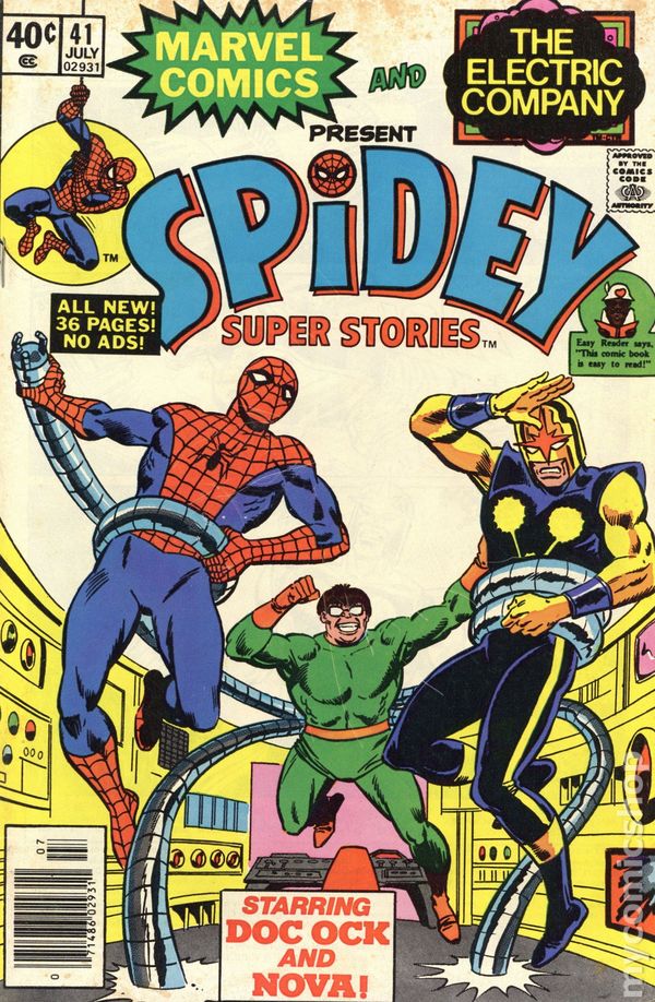 Simplified Spider-Man stories. 11 page origin story, "Spider-Man is Born!" Script by Jean Thomas (with help from Bill Effros, based on the original story by Stan Lee), pencils by Winslow Mortimer, inks by Mike Esposito. Also in this issue: "Spidey Signs Up," "Spidey Meets the Spoiler" (based on the Electric Company script by Tom Whedon), and "Help! I'm Spider-Man!" (based on a story by Byron Preiss). John Romita Sr. cover. Cover price $0.35.