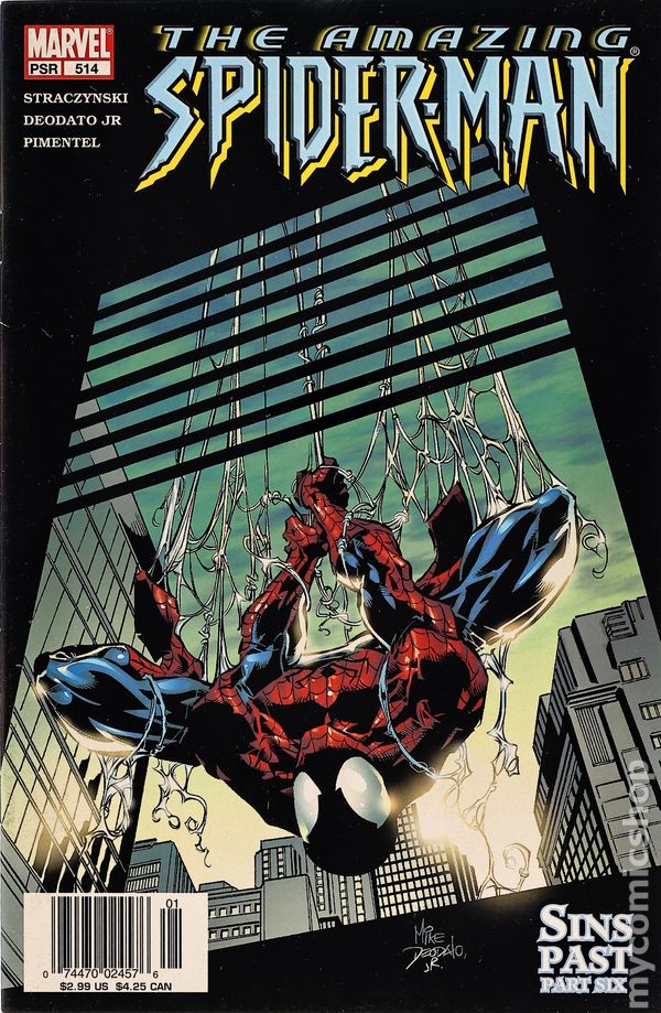 Newsstand Edition. AMAZING SPIDER-MAN #513 Written by J. Michael Straczynski Pencils & Cover by Mike Deodato JR. "SINS PAST" PART 5 (OF 6) The worst defeat that Peter Parker ever endured? a moment frozen in the minds of Spider-Man fans everywhere? was supposed to be far in his past. But now, two villains? ripped, perhaps, directly from that very moment? have emerged, and they threaten to destroy everything that he holds dear! IF YOU EVER THOUGHT YOU WERE A SPIDER-MAN FAN, YOU CAN'T MISS THIS ISSUE! 40 PGS./MARVEL PSR ...$2.25 UPC: 5960604716-51311 Cover price $2.99.