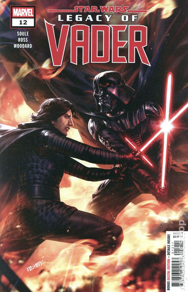(W) Charles Soule (A) Luke Ross (CA) Bengal KYLO REN IN THE PITS OF MUSTAFAR! As VANEÉ'S unhinged plans come together, KYLO REN is put to the ultimate test! The legacy of VADER comes full circle in physical form as Kylo is forced to don his grandfather's helmet! Can Kylo survive the deadly depths of VADER'S CASTLE? 28 pages, not rated, full color Cover price $3.99.