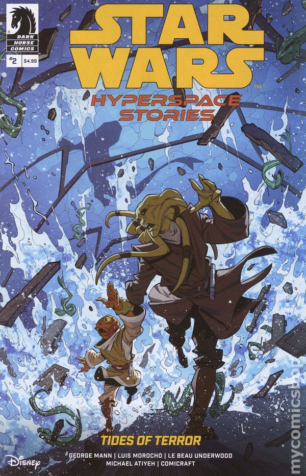 Written by George Mann. Art by Luis Morocho; Le Beau Underwood. Cover by Edwin Galmon. Jedi Master Kit Fisto has been sent to the ocean planet Torbus, alongside Mace Windu Shaak Ti, to investigate a controversial underwater research facility. But when disaster strikes, his diplomatic excursion quickly becomes a rescue mission! Kit Fisto and his fellow Jedi must race against the clock to save innocent lives from the hungry leviathans that circle in the depths.• Explore the murky depths and the leviathans that live there in this deep-sea Star Wars adventure, staring Kit Fisto! • Written by George Mann, the author of fan-favorite Star Wars titles The High Republic Adventures Phase III—Echoes of Fear and Hyperspace Stories: Qui-Gon!• Four issue series. 28 pages, full color. Cover price $4.99.