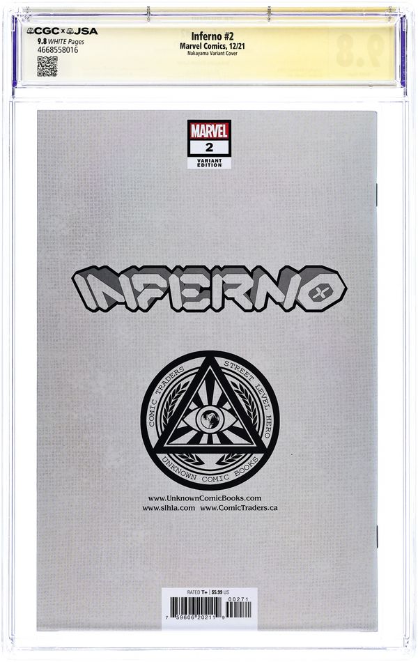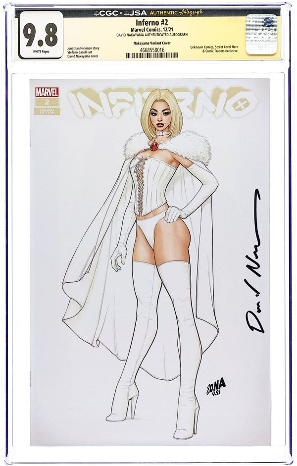 Comics Illuminati (Unknown Comics, Street Level Hero, and Comic Traders) exclusive cover by David Nakayama. Written by Jonathan Hickman. Art by Stefano Caselli. FEEL THE FIRE! Secrets. Lies. They have a way of coming out and biting you when you least expect them. The secrets and lies of Krakoa will shake it to it foundation. Head of X Jonathan Hickman, continues a tale of consequences with one of his first Marvel collaborators, artist Stefano Caselli! 52 pages, full color. RATED T+