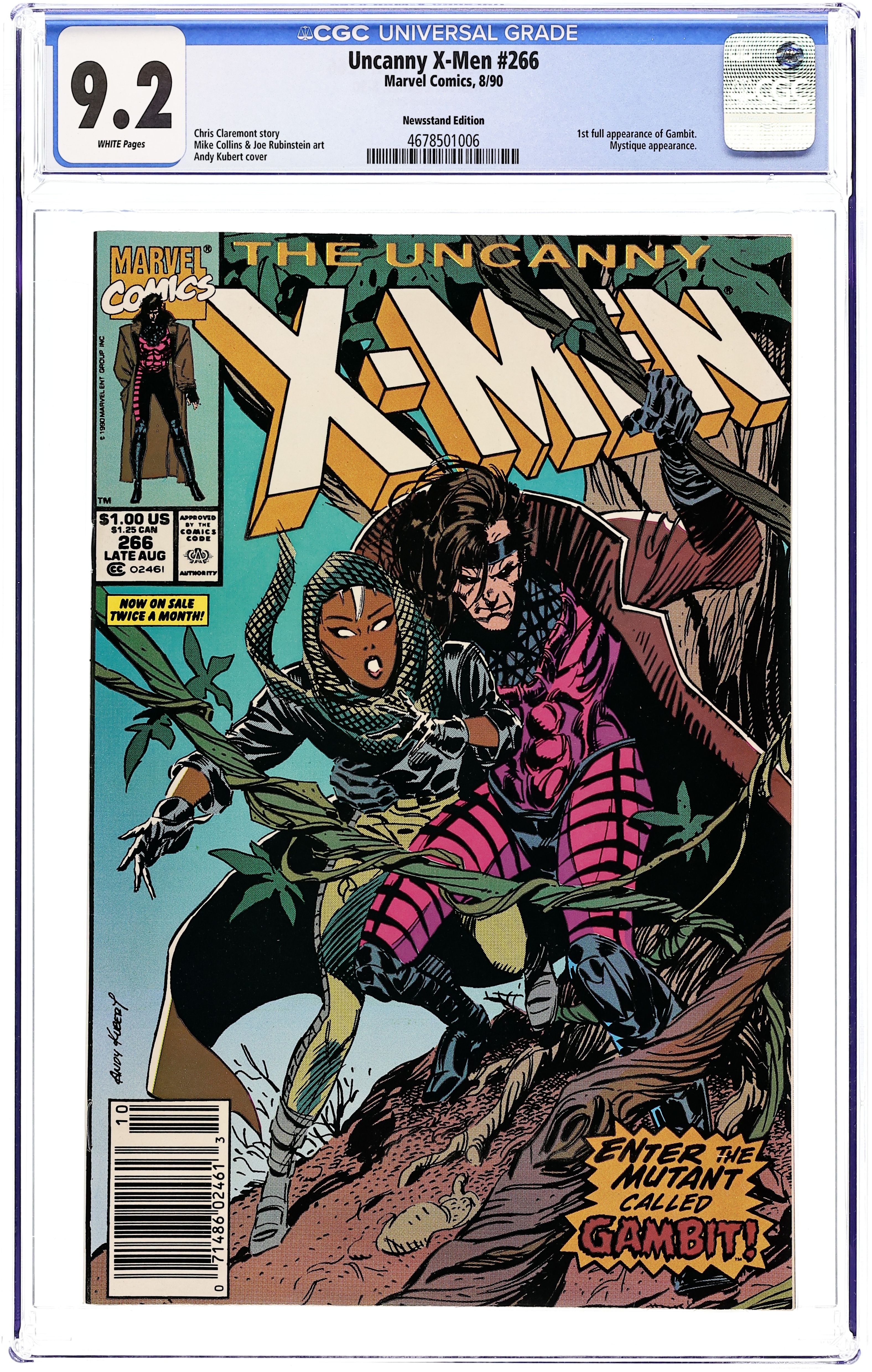 Ends Jan 15 9:54 PM CST Bid History 10 bids Current Bid $125 Your Secret Max Bid If you'd like to bid, please log in or register. Newsstand Edition. "Gambit!" Part 2 of 3. Story by Chris Claremont. Art by Mike Collins and Joe Rubinstein. Cover by Andy Kubert. The Hounds are closing in on the young thief named Storm. Her only hope may lie in the hands of a mysterious and charming stranger. Plus, the Shadow King wants Mystique dead. NOTE: 1st appearance of Gambit. 36 pages, full color. Cover price $1.00.