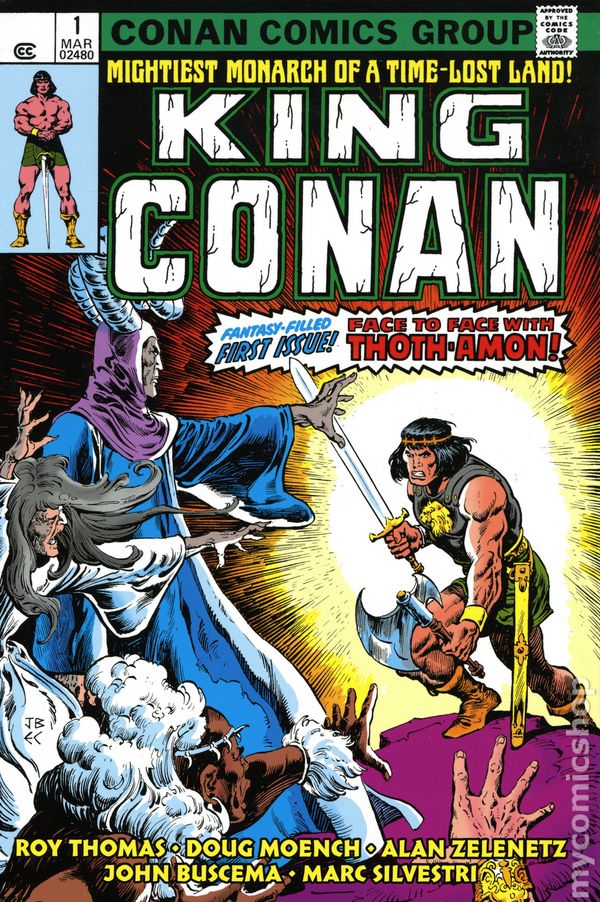 Limited 1 for 100 Retailer Incentive Variant Cover. Written by Jason Aaron. Art by Mahmud Asrar. Cover by John Buscema. CONAN'S LAST STAND AT THE EDGE OF THE WORLD! Jason Aaron and Mahmud Asrar return to the saga of CONAN in an all-new adventure that takes the story of the Cimmerian further than has ever been revealed in ANY media to date! As Robert E. Howard posited, when King Conan grows restless on the throne, he sails west, toward land and adventure unknown. Now see the first step of King Conan's fateful journey from Aquilonia, as an old and terrible danger threatens to end the saga of the Cimmerian once and for all! Don't dare miss the first issue of the adventure of a lifetime! 36 pages, full color. Parental Advisory Cover price $4.99.