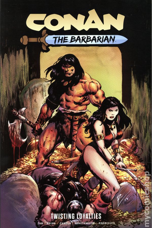 Volume 5 - 1st printing. "Twisting Loyalties!" Collects Conan the Barbarian (2023 Titan) #17-20. Written by Jim Zub. Art by Danica Brine and Doug Braithwaite. Cover by Dean Kotz. Back Cover by Roberto De La Torre. WINNER OF 'BEST WRITER' TRIPWIRE 2024 AWARDS! Conan the Cimmerian and Bêlit, Pirate Queen of the Black Coast, are in their prime, enjoying a life of decadence and debauchery, but a flagrant flash of wealth brings unwelcome attention from thieves with a taste for danger and agents from Stygia on a dark mission for their serpent god! Softcover, 112 pages, full color. Mature Readers Cover price $17.99.