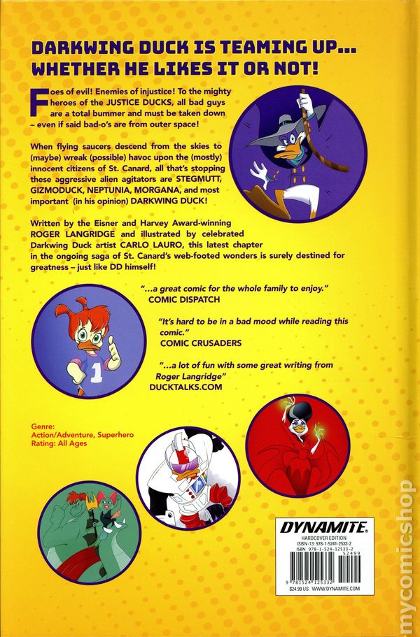 1st printing. Collects Justice Ducks (2023 Dynamite) #1-5. Written by Roger Langridge. Art by Carlo Lauro. Cover by Roger Langridge. Foes of evil! Enemies of injustice! To the mighty heroes of the JUSTICE DUCKS, all bad guys are a total bummer and must be taken down - even if said bad-o's are from outer space! When flying saucers descend from the skies to (maybe) wreak (possible) havoc upon the (mostly) innocent citizens of St. Canard, all that's stopping these aggressive alien agitators are STEGMUTT, GIZMODUCK, NEPTUNIA, MORGANA, and, most important (in his opinion), DARKWING DUCK! Written by the Eisner and Harvey Award-winning ROGER LANGRIDGE and illustrated by celebrated Darkwing Duck artist CARLO LAURO, this latest chapter in the ongoing saga of St. Canard's web-footed wonders collects Justice Ducks #1-5 (along with a complete cover gallery), and is surely destined for greatness - just like DD himself! Softcover, 128 pages, full color. Cover price $19.99.
