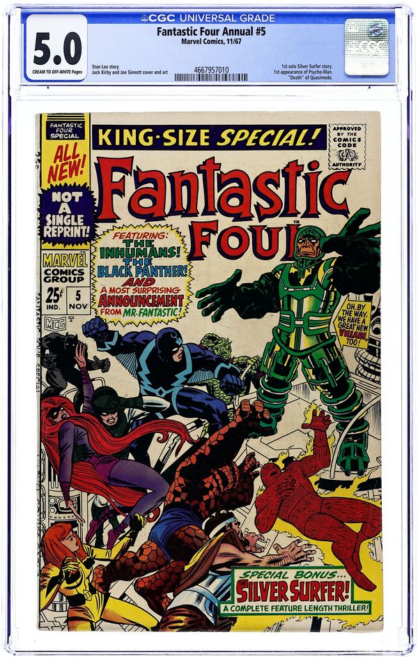 Starts Dec 15 The Black Panther and the Inhumans help the FF battle Psycho-Man (his first appearaince) in "Divide and Conquer!" Script by Stan Lee, pencils by Jack Kirby, inks by Frank Giacoia (not Joe Sinnott as credited). Silver Surfer back-up (first solo story), "The Peerless Power of the Silver Surfer!" by Lee/Kirby/Giacoia. This issue also has eight pages of pin-ups by Kirby/Giacoia and a short story, "This Is a Plot?" Script and pencils by Kirby, inks by Giacoia. Kirby/Giacoia cover. 68 pages, full color. Cover price $0.25.