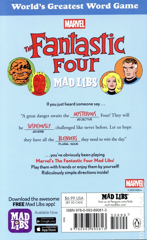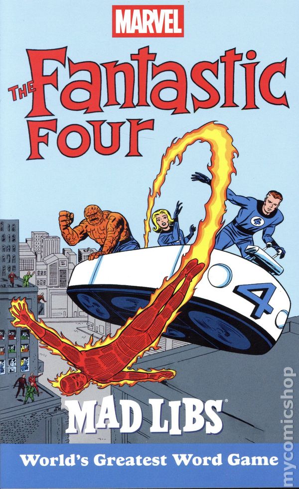 1st printing. By Brandon T. Snider. Mad Libs is the worlds greatest word game and the perfect gift or activity for anyone who likes to laugh! Write in the missing words on each page to create your own hilariously funny stories all about the Fantastic Four. With 21 fill-in-the-blank stories about the Fantastic Four, this book will be fun for any fans of the comic book characters. Play alone, in a group, or during clobberin time with Mr. Fantastic, Invisible Woman, The Human Torch, and The Thing. Mad Libs are a fun family activity recommended for ages 8 to NUMBER. Fantastic Four Mad Libs includes: - Silly stories: 21 "fill-in-the-blank" stories about the Fantastic Four! - Language arts practice: Mad Libs are a great way to build reading comprehension and grammar skills. - Fun with friends: Each Mad Libs is a chance for friends to work together to create unique stories! Softcover, 5 1/2-in. x 8 1/2-in., 48 pages, Text Only. All Ages Cover price $6.99.
