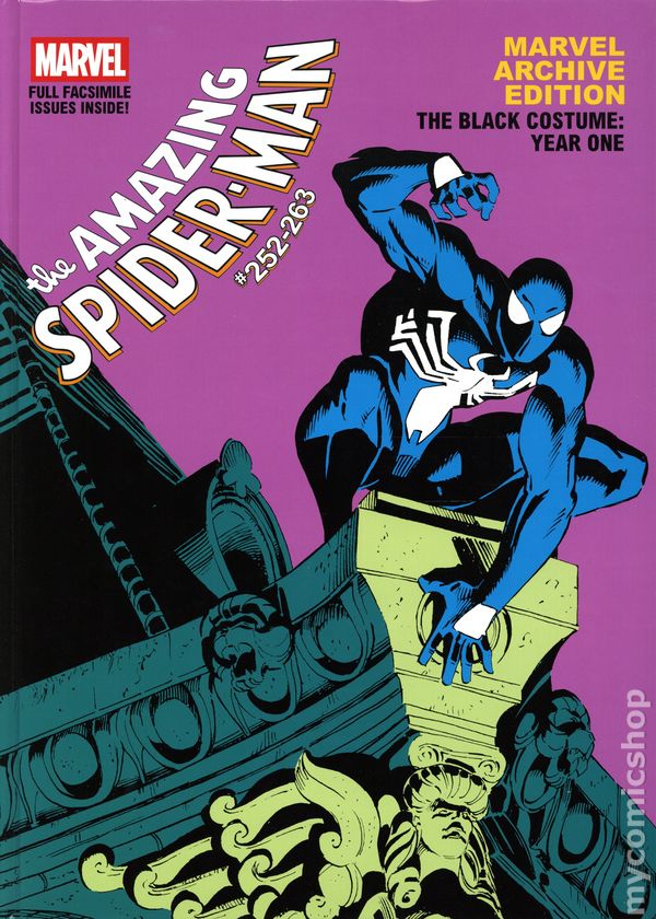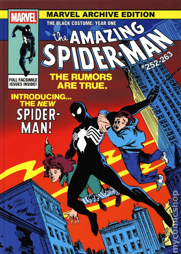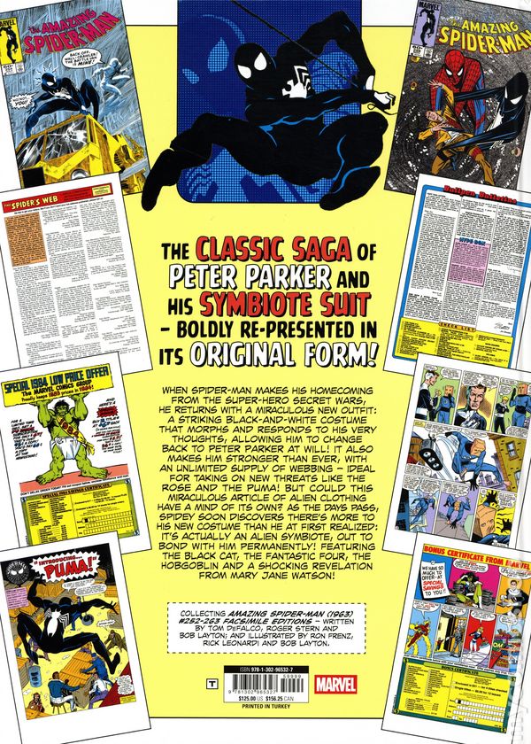Volume 1 - 1st printing. Collects The Amazing Spider-Man (1963-1998 1st Series) #252-263. Written by Roger Stern, Tom DeFalco, and Bob Layton. Art by Ron Frenz, Rick Leonardi, Bob Layton, Brett Breeding, Bill Anderson, Joe Rubinstein, Carlos Garzon, and John Beatty. Cover by Ron Frenz and Joe Rubinstein. Introduction by Ralph Macchio. THE CLASSIC SAGA OF PETER PARKER AND HIS SYMBIOTE SUIT, BOLDLY RE-PRESENTED IN ITS ORIGINAL FORM, ADS AND ALL! When Spider-Man makes his homecoming from the super-hero Secret Wars, he returns with a miraculous new outfit: a striking black-and-white costume that morphs and responds to his very thoughts, allowing him to change back to Peter Parker at will! It also makes him stronger than ever, with an unlimited supply of webbing - ideal for taking on new threats like the Rose and the Puma! But could this miraculous article of alien clothing have a mind of its own? As the days pass, Spidey soon discovers there's more to his new costume than he at first realized: It's actually an alien symbiote, out to bond with him permanently! Featuring the Black Cat, the Fantastic Four, the Hobgoblin and a shocking revelation from Mary Jane Watson! Hardcover, 9 1/2-in.x 13-in., 488 pages, full color. Rated T Cover price $125.00.