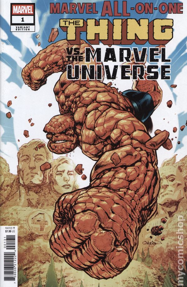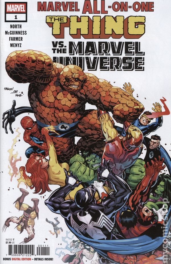 Written by Ryan North. Art by Ed McGuinness. Cover by Ed McGuinness. THE THING VS. THE MARVEL UNIVERSE - A 50-Page epic told entirely in splash pages! Ben Grimm, A.K.A. The Thing: He's the ever-lovin' idol of millions and powerhouse of the Fantastic Four. He's strong, he's kind, and he never gives up. And he's also tired, and he's sore, and he's grumpy. There's always a new threat facing the world or the galaxy or the universe - and somehow, he and the rest of the Fantastic Four are always the only ones who can stop it. Ben Grimm is sick and tired of it. He just wants a break! But when he returns to Earth after a solo mission in space to discover the Fantastic Four have turned against him - along with the rest of New York City, and, apparently, the entire world - he's got a mystery to solve...and a whole wide world to clobber. Ben Grimm takes on the entire planet in this special Marvel Anniversary issue - across 50 pages of incredible nonstop action so bold, so colossal, that the only pages that aren't splash pages are double-page spreads! •It's Marvel as you've always wanted to see it, at our biggest - our baddest - our most clobberingest! It's the wildest story we've ever published! It's Marvel All-on-One! 64 pages, full color. Rated T Cover price $7.99.
