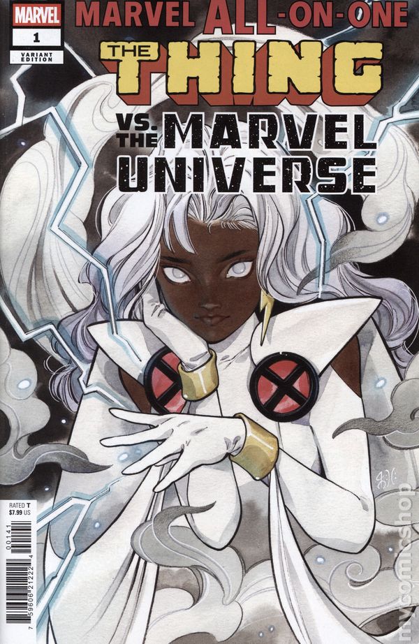 Written by Ryan North. Art by Ed McGuinness. Cover by Peach Momoko. THE THING VS. THE MARVEL UNIVERSE - A 50-Page epic told entirely in splash pages! Ben Grimm, A.K.A. The Thing: He's the ever-lovin' idol of millions and powerhouse of the Fantastic Four. He's strong, he's kind, and he never gives up. And he's also tired, and he's sore, and he's grumpy. There's always a new threat facing the world or the galaxy or the universe - and somehow, he and the rest of the Fantastic Four are always the only ones who can stop it. Ben Grimm is sick and tired of it. He just wants a break! But when he returns to Earth after a solo mission in space to discover the Fantastic Four have turned against him - along with the rest of New York City, and, apparently, the entire world - he's got a mystery to solve...and a whole wide world to clobber. Ben Grimm takes on the entire planet in this special Marvel Anniversary issue - across 50 pages of incredible nonstop action so bold, so colossal, that the only pages that aren't splash pages are double-page spreads! •It's Marvel as you've always wanted to see it, at our biggest - our baddest - our most clobberingest! It's the wildest story we've ever published! It's Marvel All-on-One! 64 pages, full color. Rated T Cover price $7.99.