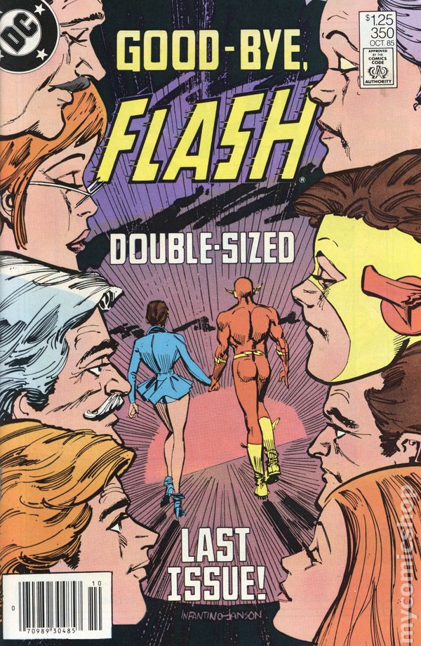 Direct Edition. Giant-sized Final Issue. Cover pencils by Carmine Infantino, inks by Klaus Janson. Flash Flees, script by Cary Bates, pencils by Carmine Infantino, inks by Frank McLaughlin; This last issue of The Flash finds the titular character and his Rogues Gallery teaming up to battle Reverse-Flash in order to correct the time line; Flash reunites with his beloved Iris in the 30th century and finds peace at last. The Flash's Final Fate is in Crisis on Infinite Earths #8. Nathaniel Dusk ad. The Outsiders ad. Super Powers VHS ad. DC Challenge ad. A Life in the Funnybooks guest editorial by Roy Thomas. Super Powers action figures ad. 52 Pages, Full Color. Cover price $1.25.