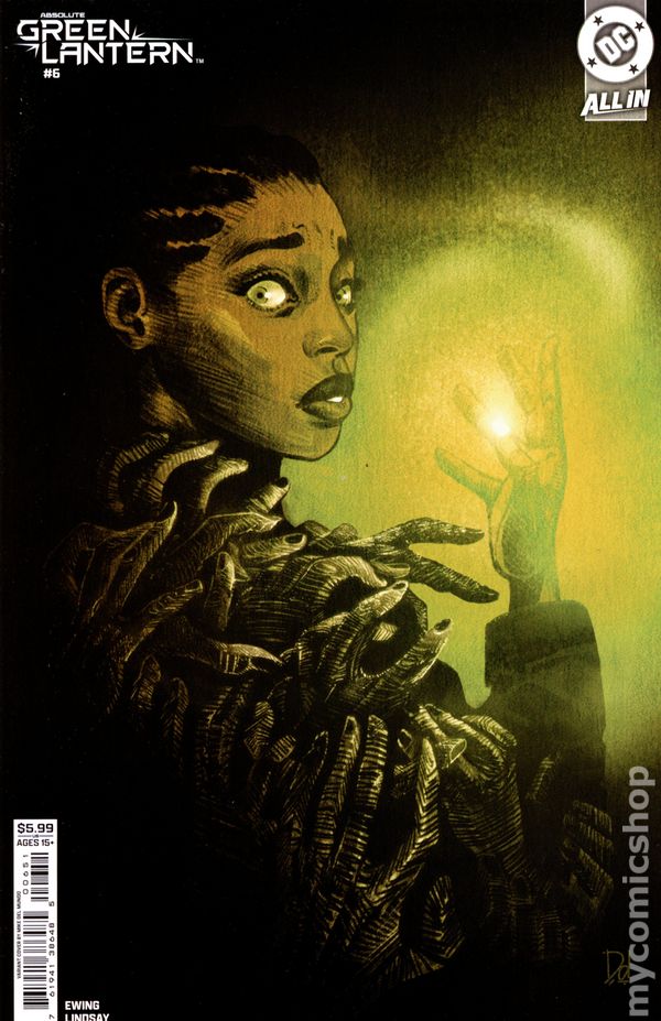 Limited 1 for 100 Retailer Incentive Variant Cover. Written by Al Ewing. Art by Jahnoy Lindsay. Cover by Jahnoy Lindsay. AL EWING AND JAHNOY LINDSAY GET COSMIC IN THE ABSOLUTE UNIVERSE! Without the Corps...without the ring...without the willpower, what's left is the Absolute Green Lantern! 40 pages, full color. Rated T+ Cover price $5.99.