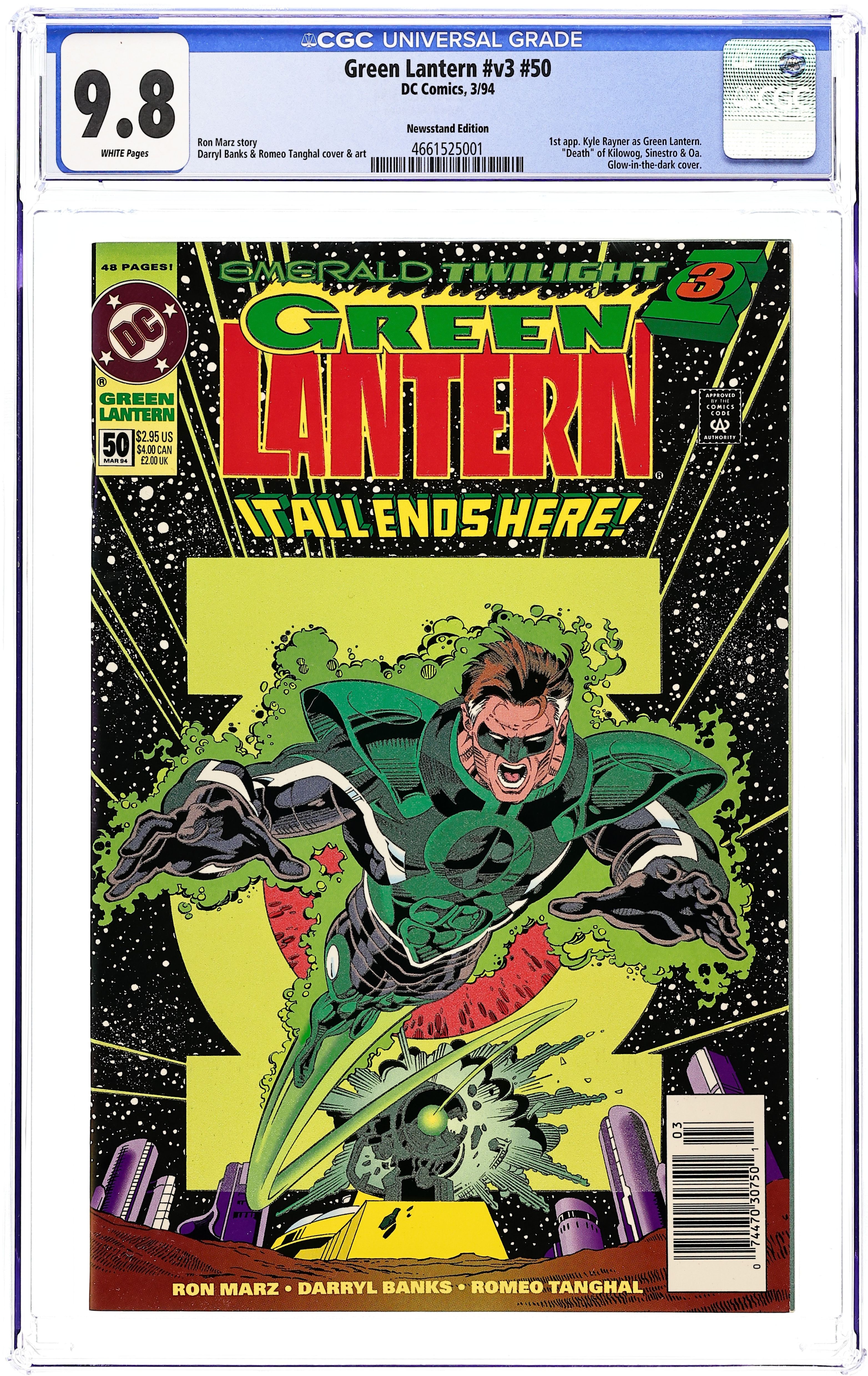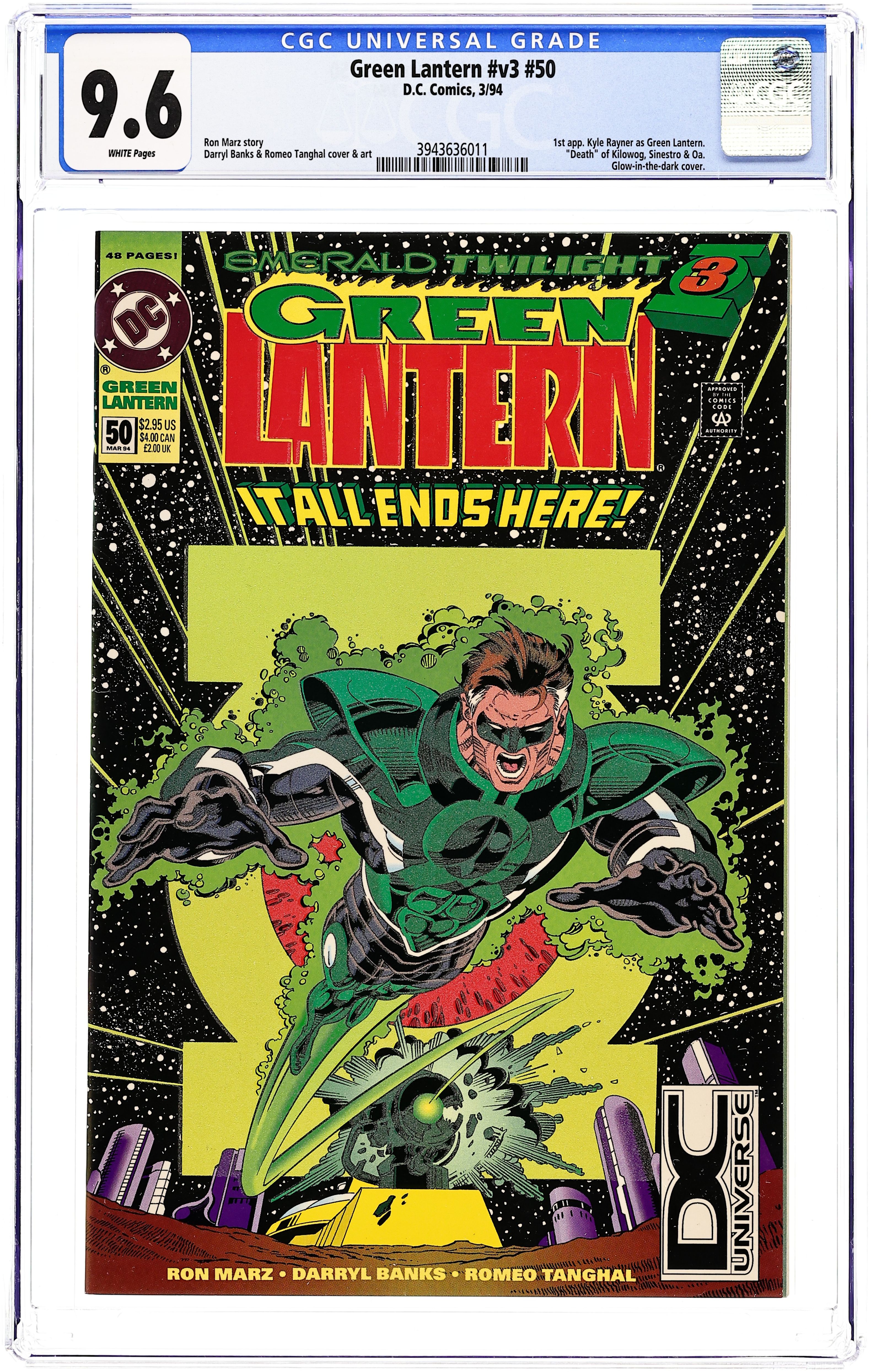 DC Universe UPC Variant. Emerald Twilight: Part 3 of 3. "The Future!" Story by Ron Marz. Art by Darryl Banks and Romeo Tanghal. Don't miss the most startling conclusion of all. In order to stop a Hal Jordan who has gone mad with grief the Guardians of the Universe have unleashed the diabolical Sinestro, Hal's former mentor and greatest adversary. It's the final showdown - Hal Jordan vs. Sinestro to the death! Plus, the birth of a new hero and a new era in the life of Green Lantern. Things will never be the same again. Includes pin-ups of Green Lantern by Jeff Johnson and Terry Austin; Stuart Immonen and Karl Story; Tom Raney; Joe Phillips; Paul Pelletier and Mark Farmer; and Craig Hamilton. NOTE: 1st appearance of the Parallax and 2nd appearance of Kyle Rayner (1st appearance as Green Lantern). 52-page giant Cover price $2.95.