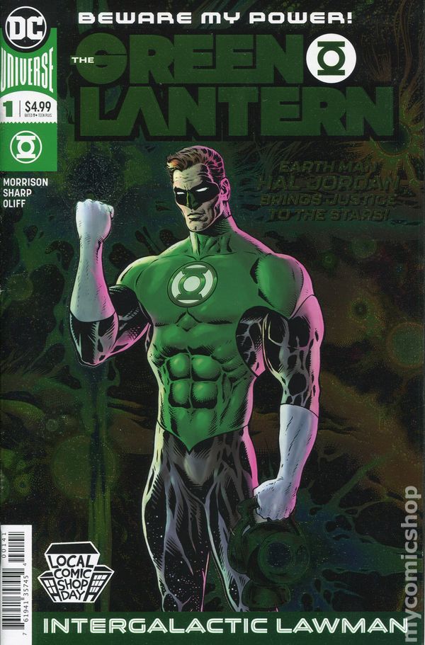 Local Comic Shop Day Edition Embossed Foil Cover by Liam Sharp. Written by Grant Morrison. Art by Liam Sharp. Superstar writer Grant Morrison (Batman, All-Star Superman) returns to DC alongside red-hot artist Liam Sharp (The Brave AND the Bold, Wonder Woman) to launch a new, ongoing series: THE GREEN LANTERN! In this debut issue, when Earth's space cop, Hal Jordan, encounters an alien hiding in plain sight, it sets off a chain of events that rocks the Green Lantern Corps-and quite possibly the Multiverse at large-to its very core. There's an inter-galactic conspiracy afoot, as well as a traitor in the GL Corps' ranks, so strap in for more mind-bending adventures in this masterpiece in the making. 40 pages, full color. Rated T+ Cover price $4.99.