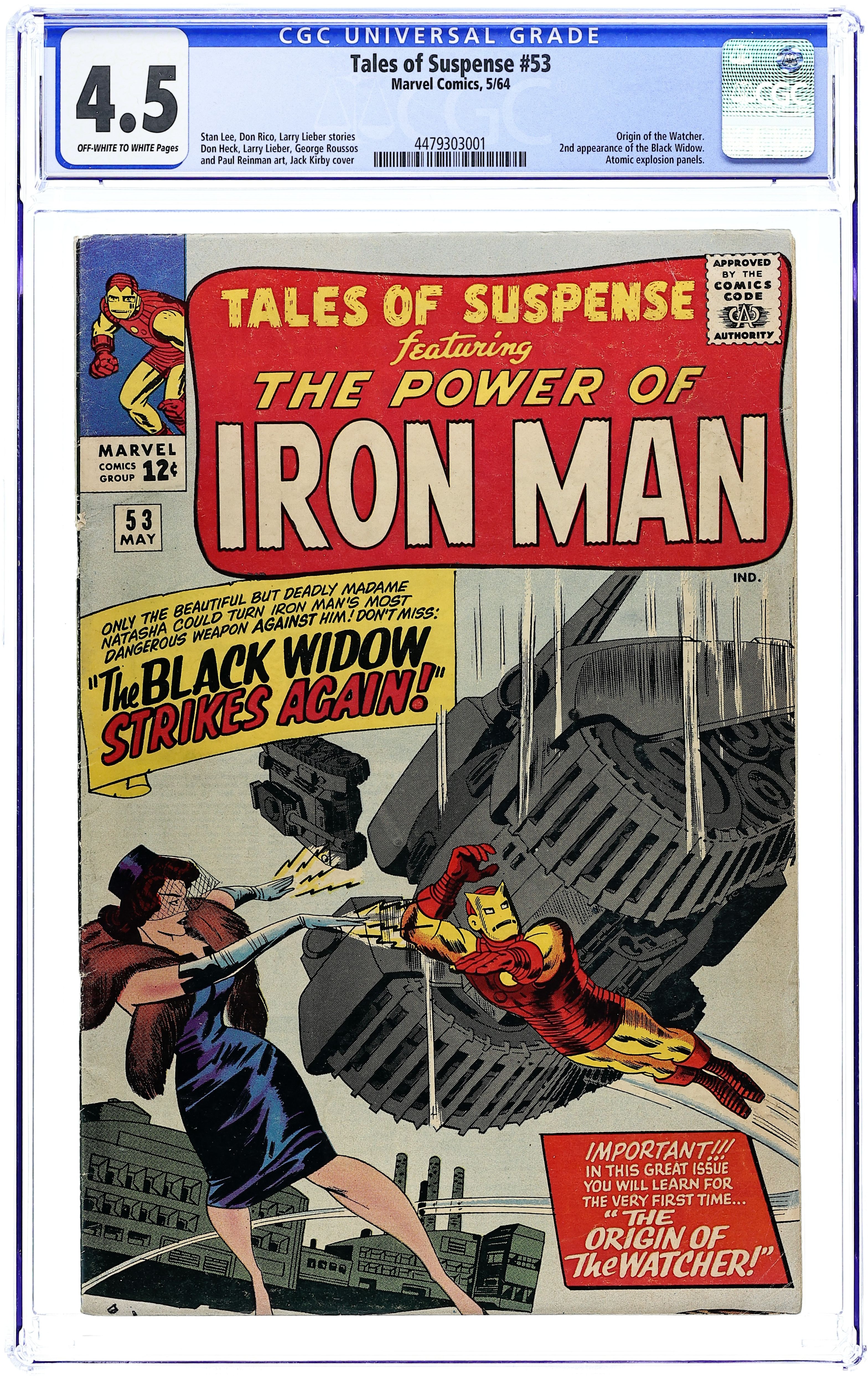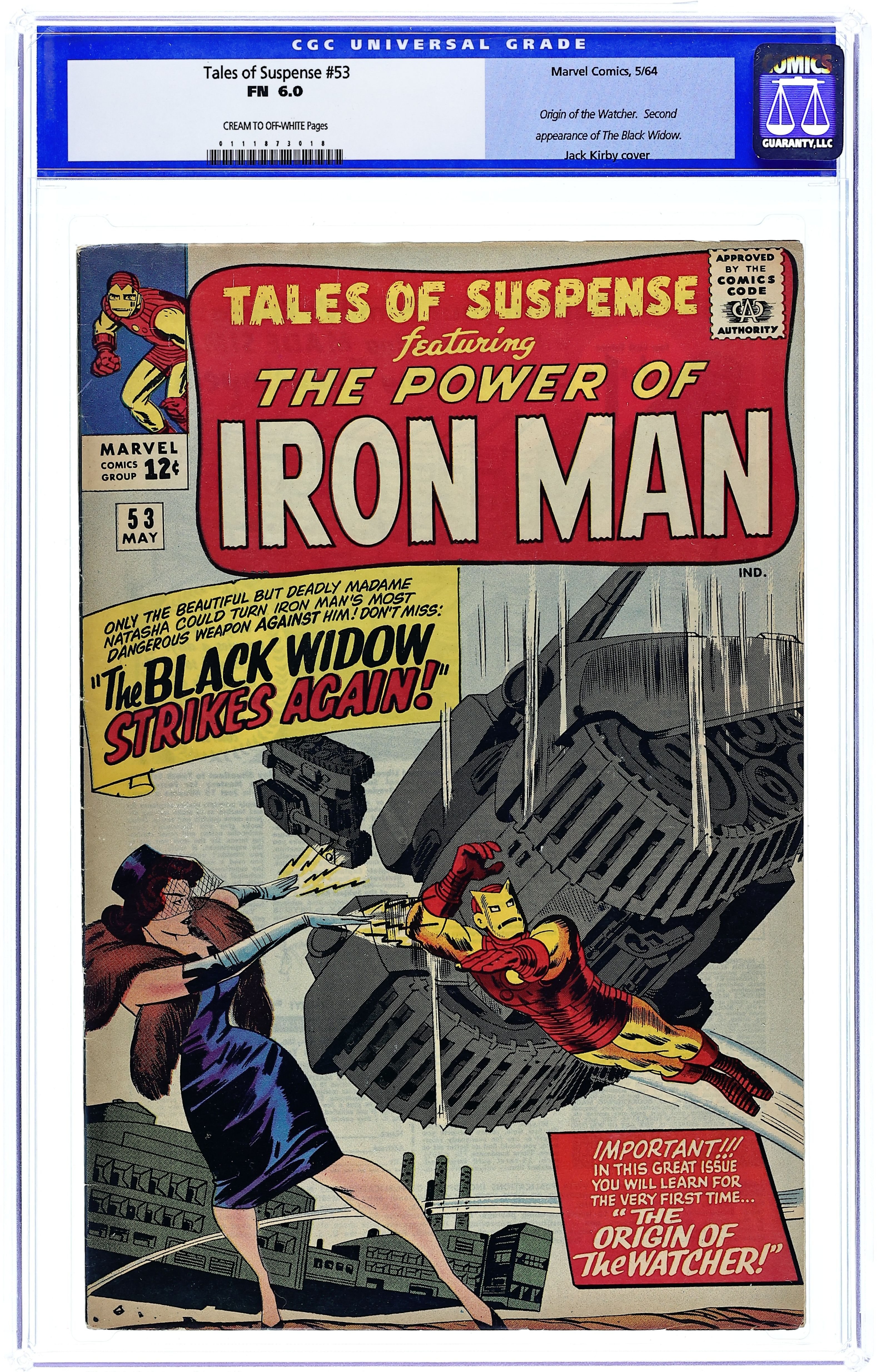 Cover pencils by Jack Kirby, inks by Sol Brodsky. Second appearance of the Black Widow in "The Black Widow Strikes Again!", script by Stan Lee (plot) and Don Rico (as N. Korok), art by Don Heck; To redeem herself in the eyes of the communist leader, Black Widow steals the new anti-grav ray device developed by Tony Stark and attacks Fort Knox; Iron Man destroys the ray device, but the Black Widow escapes. "The Magician" text story. "The Omen," script by Stan Lee (plot) and Larry Lieber (script), pencils by Larry Lieber, inks by George Roussos (as George Bell); A superstitious warlord thinks a flare of light is a good omen for an invasion, but when it is discovered to be a meteor his entire world must evacuate in order to survive. The Watcher origin in the fifth Tales of the Watcher, "The Way It Began," script by Stan Lee (plot) and Larry Lieber (script), pencils by Larry Lieber, inks by Paul Reinman; The Watcher comes from a super-advanced race that decides to share its technology with others; When their first attempt ends in tragedy, they vow never to interfere with the affairs of less advanced species. The second half of "The Magician" (text story). 36 pages, full color. Cover price $0.12.