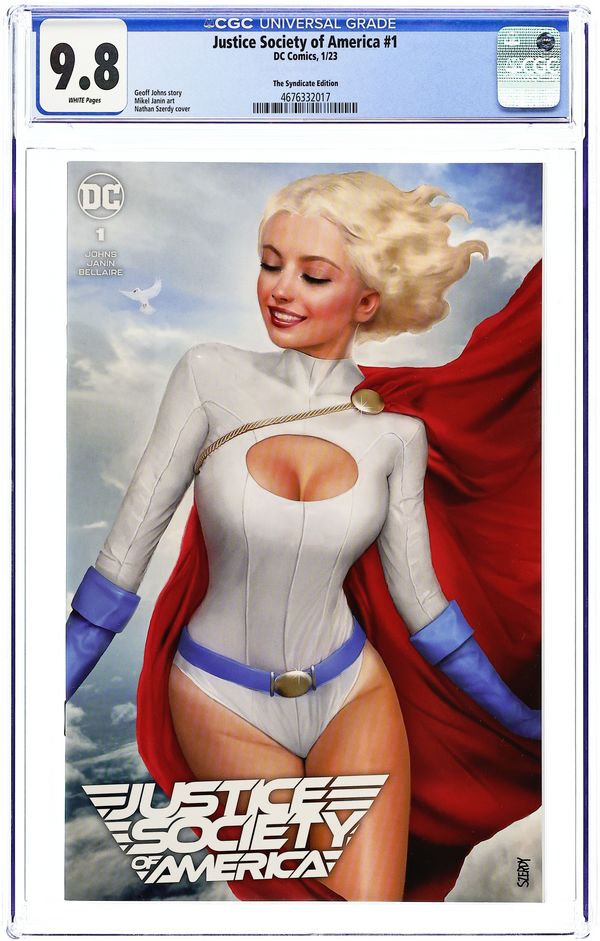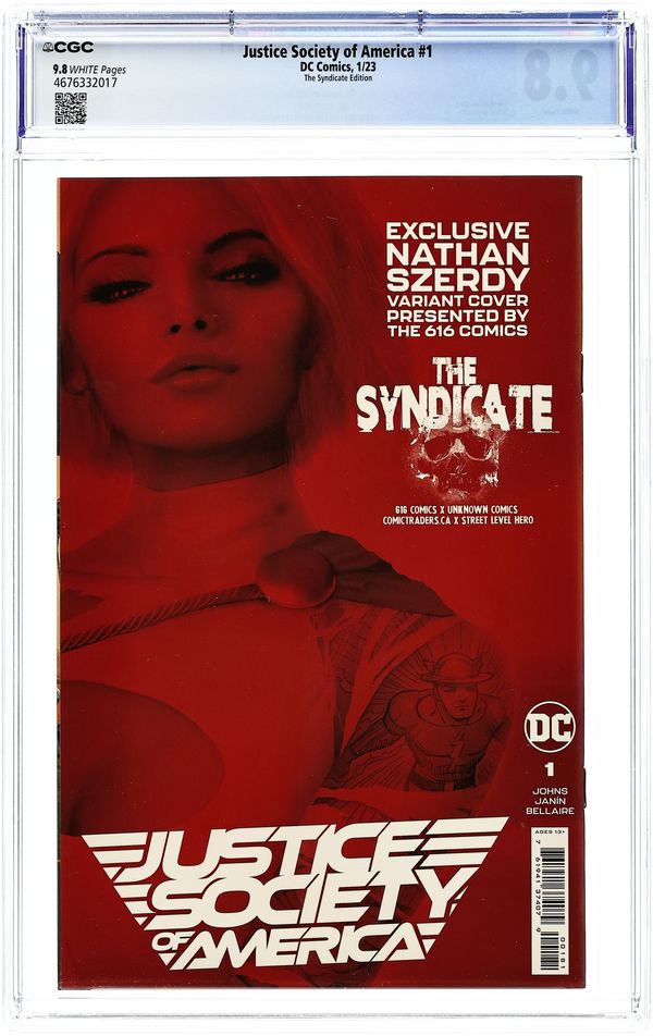 The Syndicate (The 616 Comics, Unknown Comics, Comic Traders, and Street Level Hero) Exclusive Virgin Cover by Nathan Szerdy. Written by Geoff Johns. Art by Mikel Janin. The JSA returns in this monthly series by writer Geoff Johns and artist Mikel Janin with Justice Society of America: The New Golden Age Part One! The world's first and greatest superheroes return! Or do they? A long-lost hero from the JSA crashes into our era with a grave warning... but it's too late. A mysterious and malevolent enemy has invaded the entire history of the JSA, and an all-new team must come together to defeat it. But what deadly secret does this messenger from beyond keep? Where are they from? And why is all of this happening now? Only the Time Masters know... 32 pages, full color. Rated T+