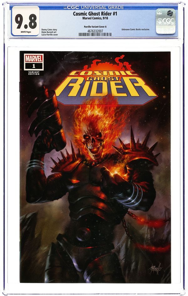 Unknown Comics exclusive Variant Cover by Lucio Parrillo. Written by Donny Cates. Art by Dylan Burnett.. EXPLODING FROM THE PAGES OF THANOS! Frank Castle was the Punisher. A deal with the devil made him Ghost Rider. A deal with Galactus made him cosmic. A deal with Thanos made him…DEAD?!? Not to worry, he's coming back, and he's got a plan to make the universe a better place that's going to lead him into an even CRAZIER adventure than he's ever been in! Join hot new comic (and cosmic?) writer Donny Cates (THANOS, DOCTOR STRANGE) as he pushes his wildest creation past the breaking point! 36 pages, full color. Rated T+