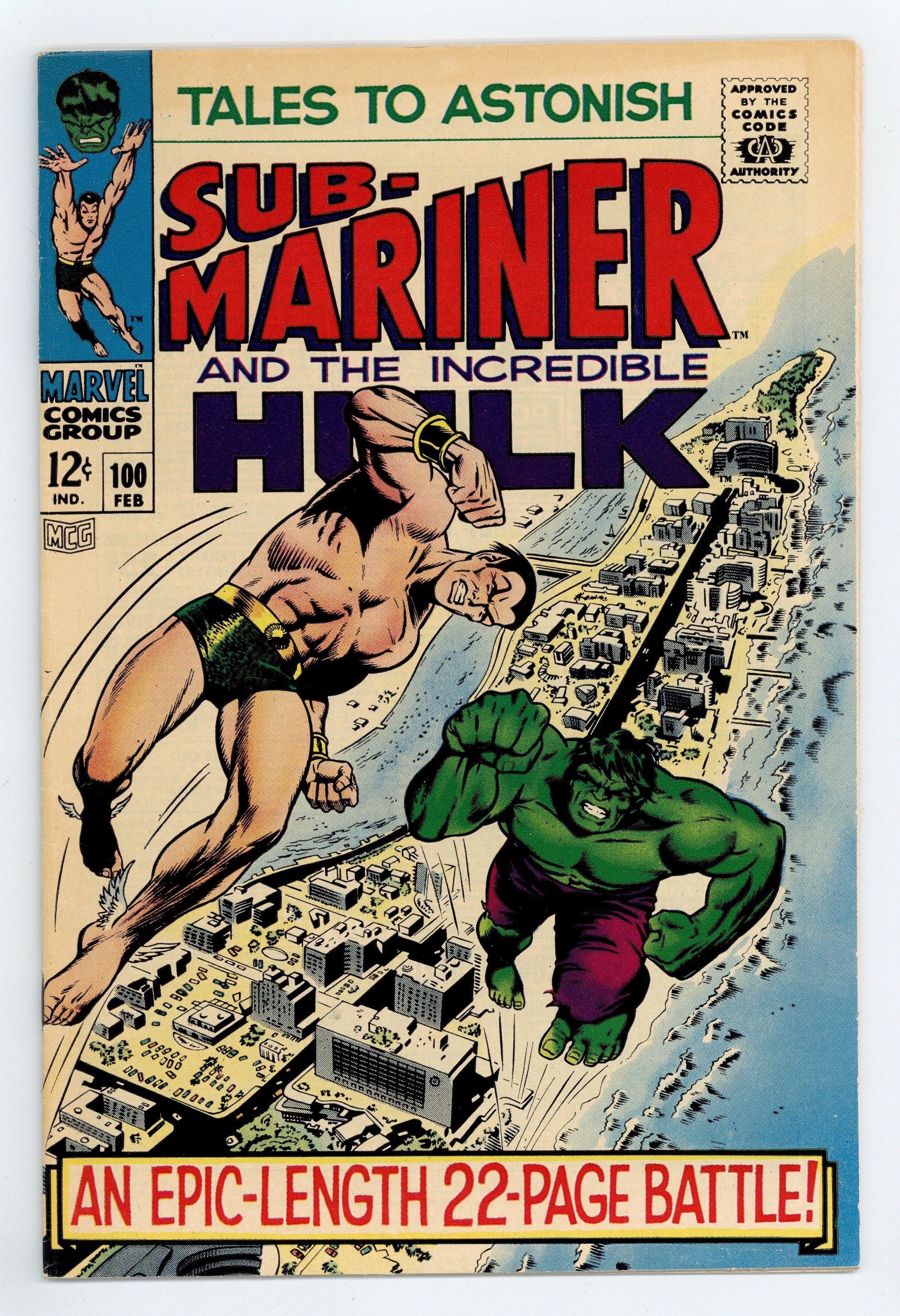 Starts Apr 27 Cover by Gil Kane. Outside the Gates Waits..Death!, script by Stan Lee, art by Bill Everett and Dan Adkins; As the new ruler of Atlantis, Byrrah has Namor arrested and sent to the dreaded Inferno Isle; Namor battles the lava monster that lives there and returns to Atlantis to seek his vengeance; Meanwhile, back in the undersea kingdom, Dorma has found Byrrah's hypnosis machine that won him the throne and uses it to turn the Atlantean allegiance back to Namor. Whosoever Harms the Hulk..!, script by Stan Lee, art by Gil Kane; Ross and his men try to revive the Hulk after his beating by the Abomnation; Returning from the brink of death, Hulk is about to leave when the pleading Rick Jones causes him to transform back to Banner; Banner uses his knowledge to lure Abomination back to Gamma base with Betty in tow; Hulk and Abomination clash once again; Watching from a distant galaxy, the Stranger realizes that the Abomination is a much better ally than the Hulk and zaps him to his side, ending the battle. 36 pgs., full color. $0.12. Cover price $0.12.