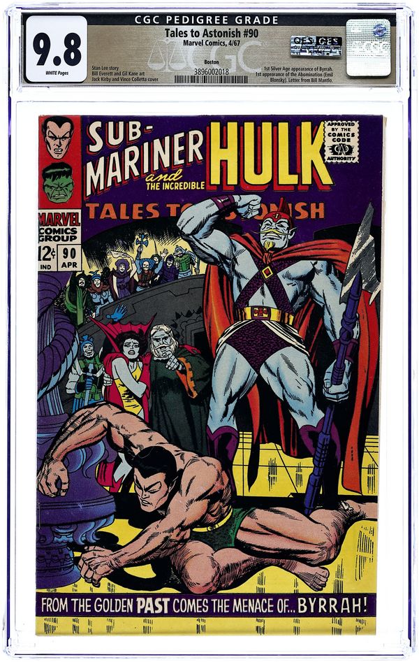 Cover by Jack Kirby and Vince Colletta. To Be Beaten by Byrrah!, script by Stan Lee, art by Bill Everett and Marie Severin; Namor's cousin wins the favor of the populace of Atlantis as well as the Atlantean council by belittling the regime of the Sub-Mariner as violent and unstable; He challenges Namor to single combat for the right to rule and no one is more surprised than the avenging son when his powers desert him during the fight and Byrrah handily wins. The Abomination!, script by Stan Lee, art by Gil Kane; The Stranger leaves earth with the rampaging Hulk left behind to wreak destruction on his behalf; Turning back into his alter ego, Banner surrenders himself to Gamma base and tries to kill himself with radiation to stop the Hulk's destruction; Stopped before he can use his gamma machine, the machine is instead used by a foreign spy who is transformed into the Abomination; More powerful than even the Hulk, Abomination beats the jade giant down and kidnaps Betty as he escapes from the base. Letter from Bill Mantlo. 36 pgs., full color. $0.12. Cover price $0.12.