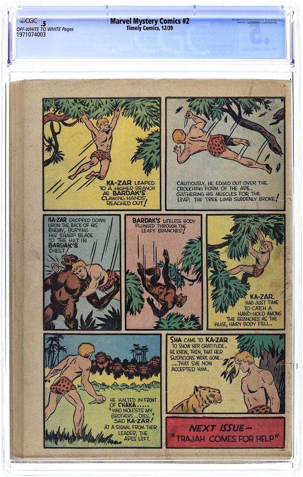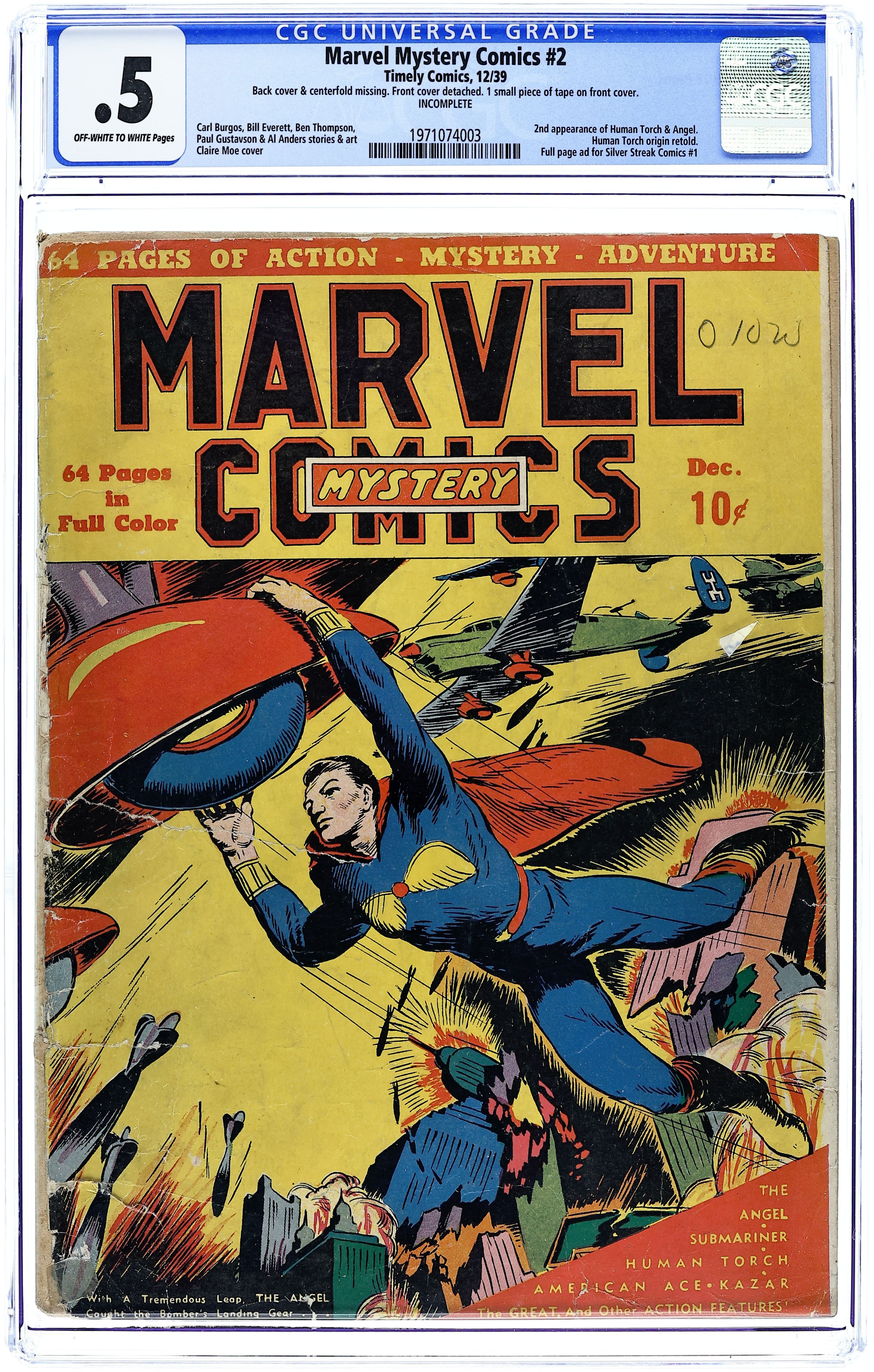 Cover art by Charles J. Mazoujian. Ad for Silver Streak Comics 1; art by Jack Cole. Human Torch untitled story, script and art by Carl Burgos; The Torch must battle a racketeer who wants his racing car to win so badly that he uses an airplane that fires incendiary bullets into the other cars. The Angel untitled story, art by Paul Gustavson; The Angel saves a woman's life, all over a map with a curse on it, as it reveals the location of a treasure connected to the lost temple of Alano. Sub-Mariner untitled story, script and art by Bill Everett; Namor heads for New York City, and while securing a disguise, a young woman accidently sets her dress ablaze with a cigarette; Deciding that she can be of value to him in his avowed war against the Americans, he kidnaps her from the hospital and takes her to his undersea kingdom. The Masked Raider untitled story, art by Al Anders; The Raiders disguises himself as a fugitive in order to infiltrate a gang that has been harrassing and robbing ranches in several towns. American Ace origin story, art by Paul J. Lauretta; Queen Ursula of Castle D'or, whose empire was shattered when she lost her colonies during WWI, plans revenge. Death-Bird Squadron text story starring The Angel, script by David C. Cooke, art by Mazoujian. Advenures of Ka-Zar the Great untitled story, art by Ben Thompson; After the death of his parents, Ka-Zar goes to live in the cave of his friend, Zar, but soon faces Bardak, who has found a mirror in the abandoned tent of De Kraft, and refuses to relinquish it; Ka-Zar takes it from him and Bardak swears revenge. 68 pages. Cover price $0.10.
