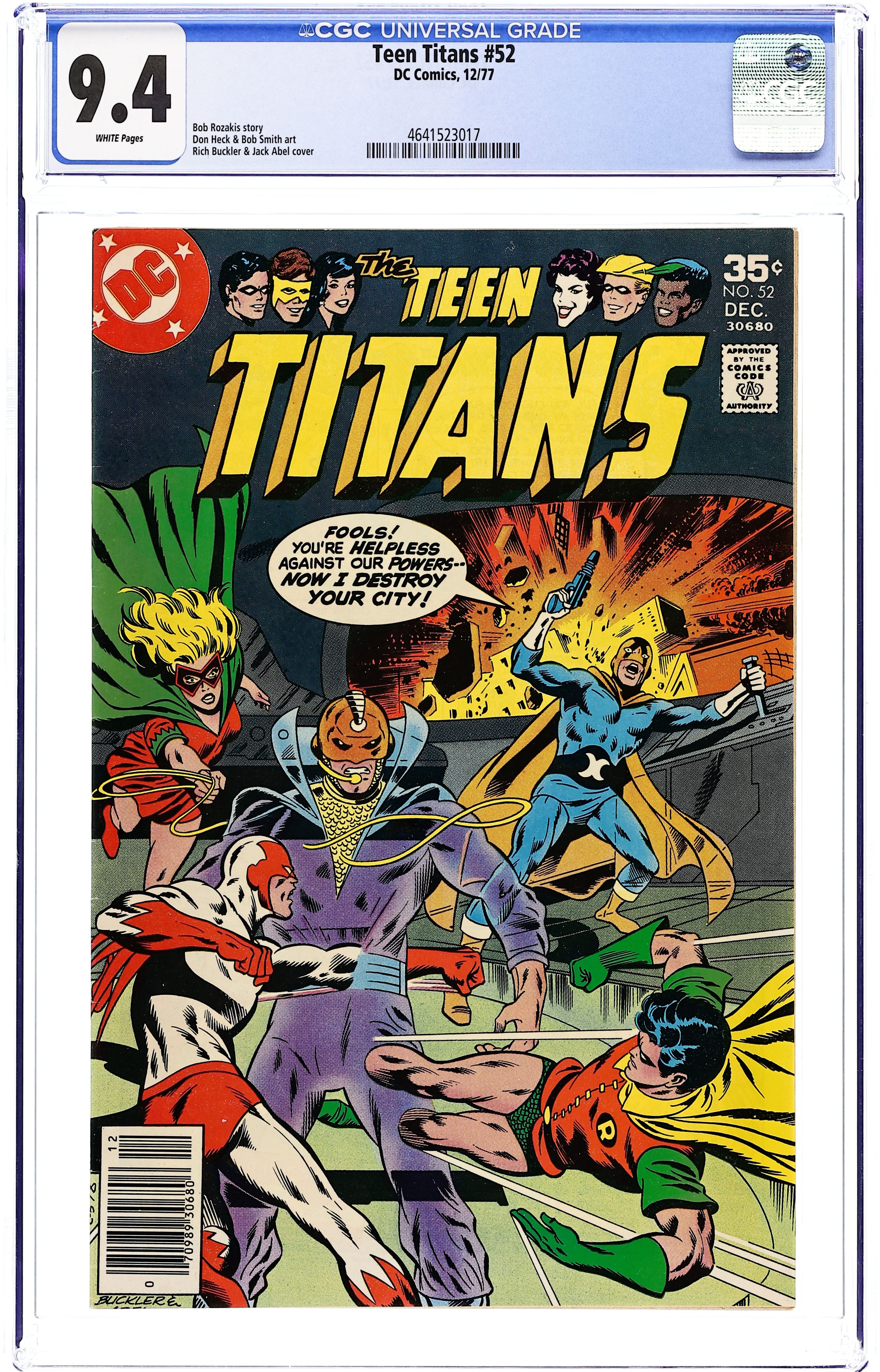 Written by Bob Rozakis. Art by Don Heck and Bob Smith. Cover by Rich Buckler and Jack Abel. The Titan groups join forces to defeat Captain Calamity. 36 Pages, Full Color. Cover price $0.35.