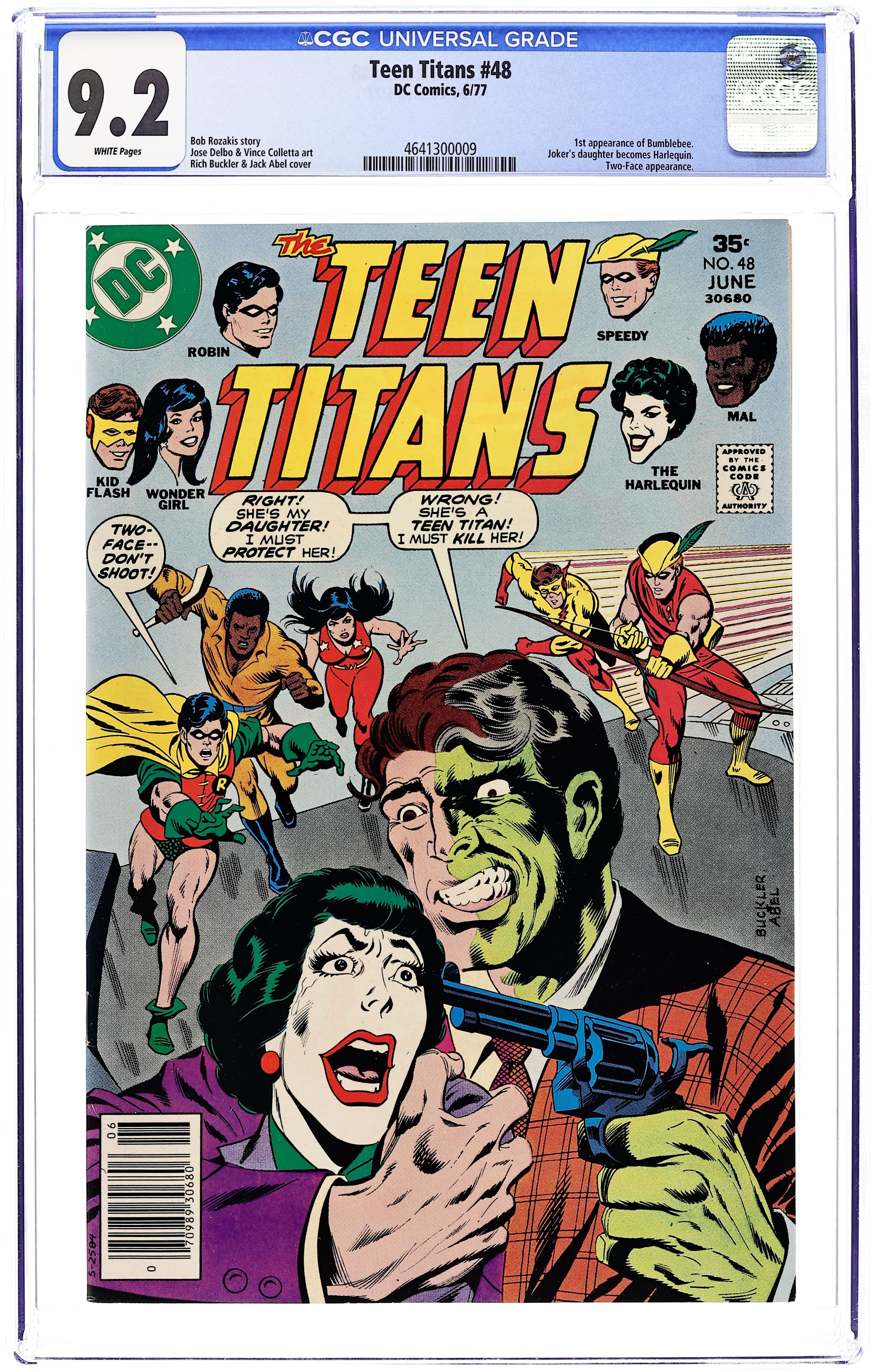 Written by Bob Rozakis. Art by Jose Delbo and Vince Colletta. The Titans save New York and Gotham from Two-Face. Joker's Daughter (Duela Dent) revealed to be Two-Face's daughter and takes name Harlequin. Karen Beecher becomes Bumblebee. Profile of Bob Rozakis by Mike Gold. 36 Pages, Full Color. Cover price $0.35.