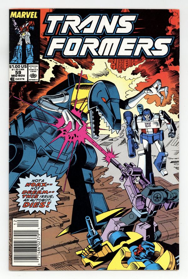 Starts Jan 19 First Printing. Direct Edition. Part 4 of 4. Story by Jim Salicrup. Art by Frank Springer, Ian Akin and Brian Garvey. Cover by Mark Texeira. It's the Autobots' last stand. Low on fuel and out matched, these benevolent Transformers fall before their oppressor rivals, the vile Decepticons. This story's end proves one thing...the good guys don't always win. This is a first printing. All 2nd or 3rd printings have a 2nd, 3rd printing notice on inside at bottom of indicia on first/splash page. 2nd printings were done for most issues from #1 to #9. Cover price $0.75.