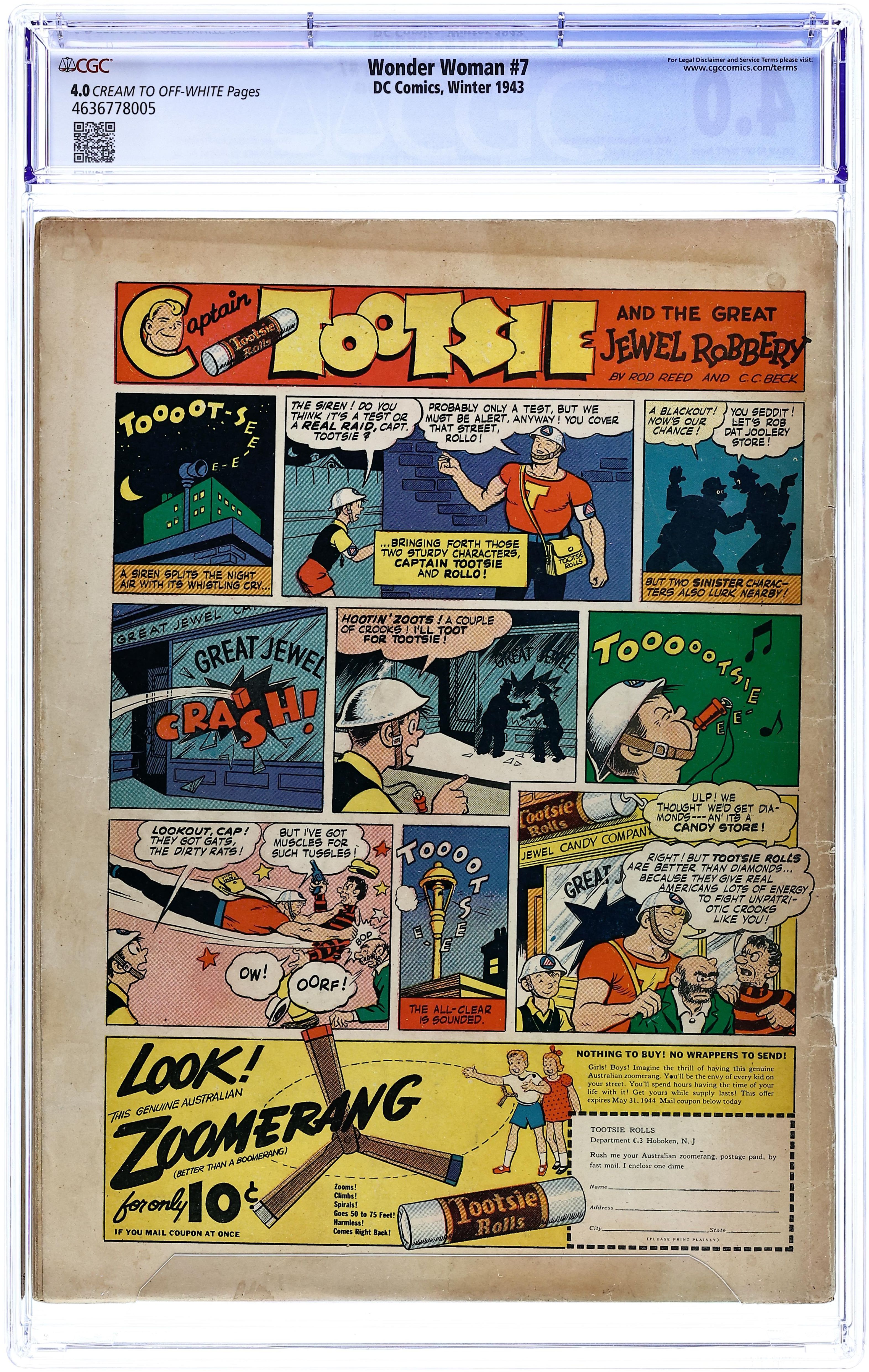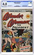 Cover by Harry G. Peter. "The Adventure of the Life Vitamin," script by William Moulton Marston (as Charles Moulton), art by Harry G. Peter; While visiting Paradise Island, Wonder Woman is shown the future through the Magic Sphere, in which the Amazon Princess and Etta discovering a vitamin that will extend human life and can restore youth. "America's Wonder Women of Tomorrow!", script by William Moulton Marston (as Charles Moulton), art by Harry G. Peter; As Wonder Woman continues to view the future in the Magic Sphere, she sees Steve nominated for President in the year 3004. Realizing that Steve has been elected unfairly, as Diana Prince Wonder Woman is elected President. Women of History: four-page Joan of Arc bio, script by Alice Marble, pencils by Paul Reinman, inks by Sam Burlockoff. Join The Junior Justice Society of America ad. "The Secret Weapon," script by William Moulton Marston (as Charles Moulton), art by Harry G. Peter; Primal Island is overthrown in the year 3700 by Moteeva and Wonder Woman is captured by Moteeva's troops. "Davidura" text story by Hop Harrigan. "Demon of the Depths," by William Moulton Marston (as Charles Moulton), art by Harry G. Peter; Paula's daughter Gerta is a strong willed child, and will have a bad future unless Wonder Woman and Paula can make her more submissive to authority. Tootsie Roll back cover ad, "Captain Tootsie and the Great Jewel Robbery" by Rod Reed and C.C. Beck. 60 Pages, Full Color. Cover price $0.10.