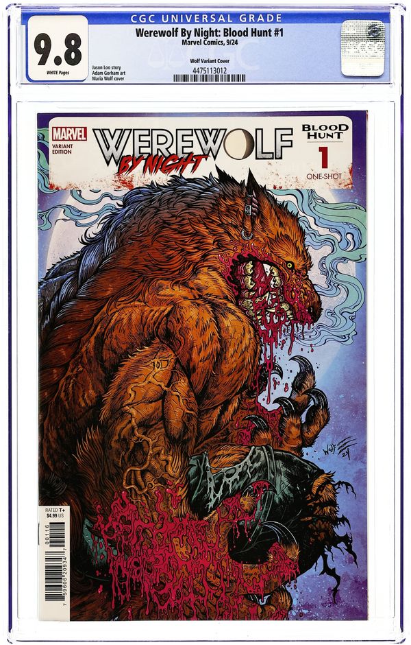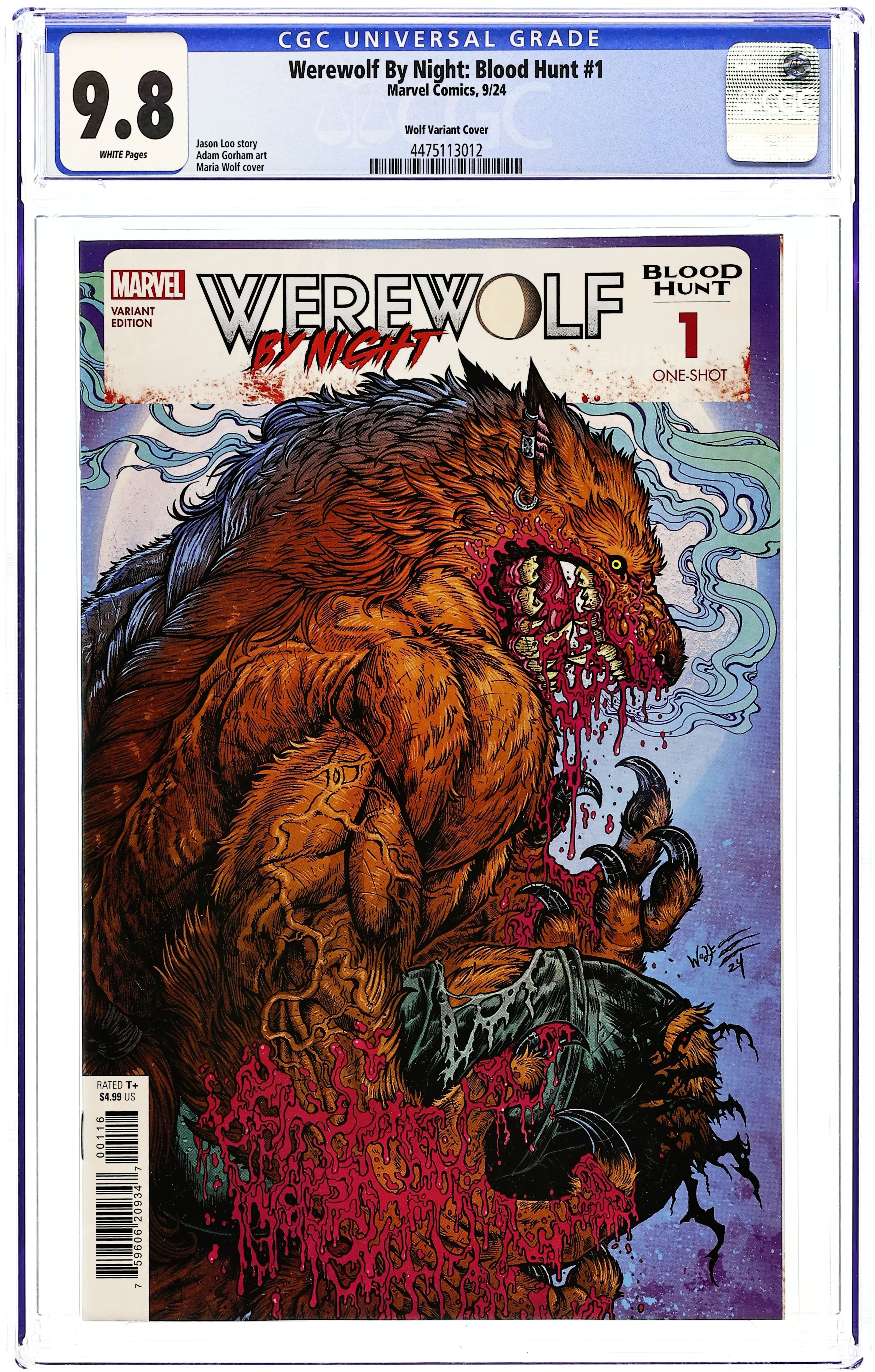 Limited 1 for 25 Retailer Incentive Variant Cover. Written by Jason Loo. Art by Adam Gorham. Cover by Maria Wolf. As the BLOOD HUNT wreaks untold havoc across the Marvel Universe, one of those affected in most unexpected ways is the WEREWOLF BY NIGHT! Imbued with NEW ABILITIES, a NEW LOOK, and a DANGEROUS NEW DIRECTION, this Werewolf by Night is UNLIKE ANY YOU HAVE SEEN OR KNOWN BEFORE! Starring JAKE GOMEZ, this is one tie-in no BLOOD HUNT reading order is complete without! 32 pages, full color. Rated T+ Cover price $4.99.