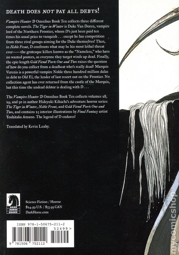 Volume 10 - 1st printing. Collects Vampire Hunter D SC (2005-2020 Dark Horse/DMP Novel Series) Vol. 28-30. Written by Hideyuki Kikuchi. Art and cover by Yoshitaka Amano. Translated by Kevin Leahy. The hunt continues in the bizarre far future of 12,090 A.D, where the immortal vampire lords who were the only winners of mankinds nuclear war still oppress the human survivors who have pushed the blood-drinking fiends back to the lawless Frontier. Yet humanity too remains as quick as ever to prey upon itself, and where the law cant bring safety or justice, the crescent blade of D will—assuming you meet the half-vampire wanderers price! Vampire Hunter D Omnibus Book Ten collects three different complete novels. The Tiger in Winter is Duke Van Doren, vampire lord of the Northern Frontier, whom Ds just been paid ten times his usual price to vanquish…except he has competition from three rival groups aiming for the Duke themselves! Then, in Noble Front, D confronts what may be his most lethal threat ever—the grotesque killers known as the Nameless, who have no wanted posters, as everyone they target winds up dead. Finally, the epic-length Gold Fiend Parts One and Two raises the question of how do you collect from a deadbeat whos really dead? Marquis Verenis is a powerful vampire Noble three hundred million dalas in debt to Old El, the lender of last resort out on the Frontier. No collection agent has ever returned from the castle of the Marquis, but this time the undead debtor is dealing with D… The Vampire Hunter D Omnibus Book Eight collects volumes 28, 29, and 30 in author Hideyuki Kikuchis adventure horror series: The Tiger in Winter, Noble Front, and Gold Fiend Parts One and Two. Illustrated by Final Fantasy artist Yoshitaka Amano, the legend of D endures! Softcover, 5-in. x 7-in., 704 pages, Text (with B&W Chapter Illustrations). Cover price $24.99.