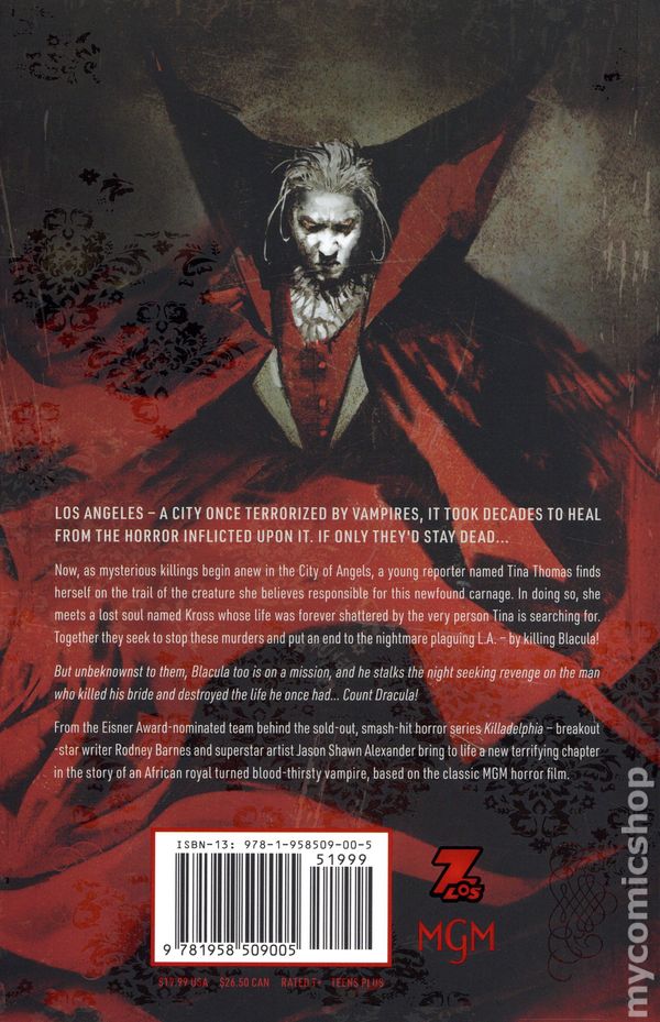 1st printing. Written by Rodney Barnes. Art by Jason Shawn Alexander and Scott Hampton. Cover by Jason Shawn Alexander. Introduction by Rodney Barnes. Essay by Stephen R. Bissette. Los Angeles-the City of Angels. Two souls, one is looking for vengeance and one is looking for the truth. They share one thing in common, they are both searching for the legendary vampire Blacula. Tina Thomas is a reporter for the blog Dark Knights, which chronicles all things unnatural, uneasy, and undead. She meets a young man named Kross whose family was forever changed by the vampire. Kross asks Tina to help him kill Blacula. Blacula too is on a mission, he is searching for the one who forever changed his life centuries ago. His name is Count Dracula. Hardcover, 128 pages, full color. Cover price $29.99.