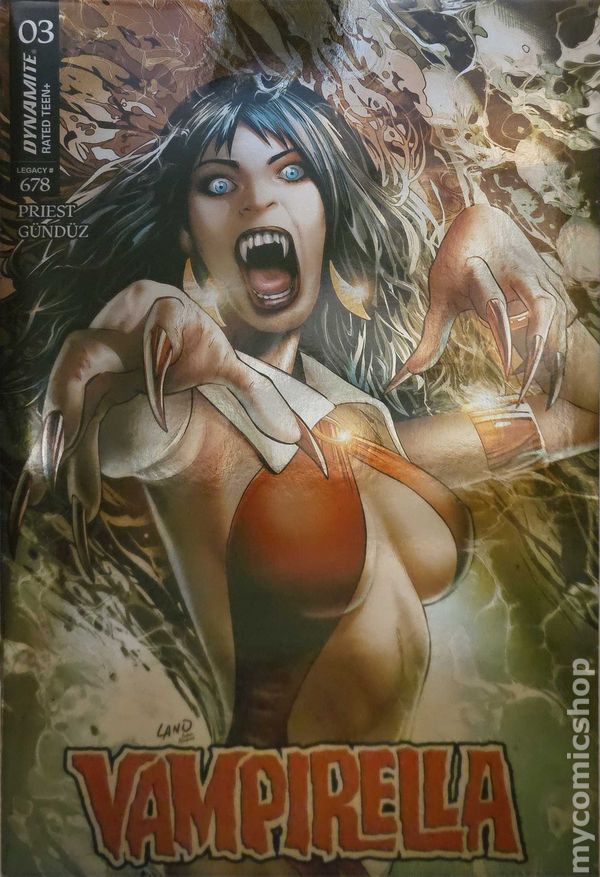 Limited 1 for 25 Retailer Incentive Variant Cover. Written by Christopher Priest. Art by Ergun Gunduz. Cover by Greg Land. THE SACRED SIX RETURN! With her postpartum depression raging and her infant son inconsolable, an overwhelmed Vampirella goes AWOL and lands in Las Vegas - where her presence panics the local vampires into preemptively attacking her. Meanwhile, in the darkly possible future, the increasingly erratic Daughter of Drakulon leads the other members of the Sacred Six - Pantha, Nyx, Chastity, Victory, and Vampirette - on a mission which may finally push Vampirella permanently over the edge! 32 pages, full color. Rated T+ Cover price $4.99.