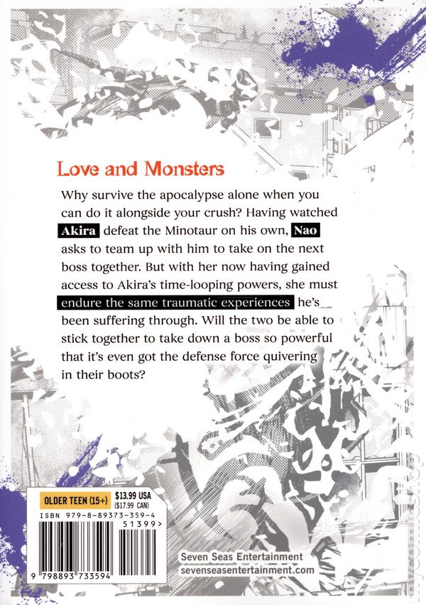 Volume 3 - 1st printing. Written by Shigeru Hajima. Art and cover by Tsubasa. Character Design by Ryuta Fuse. Translated by Jacqueline Fung. LOVE AND MONSTERS. Why survive the apocalypse alone when you can do it alongside your crush? Having watched Akira defeat the Minotaur on his own, Nao asks to team up with him to take on the next boss together. But with her now having gained access to Akiras time-looping powers, she must endure the same traumatic experiences hes been suffering through. Will the two be able to stick together to take down a boss so powerful that its even got the defense force quivering in their boots? Softcover, 5-in. x 7-in., 184 pages, B&W. Rated T+ Cover price $13.99.