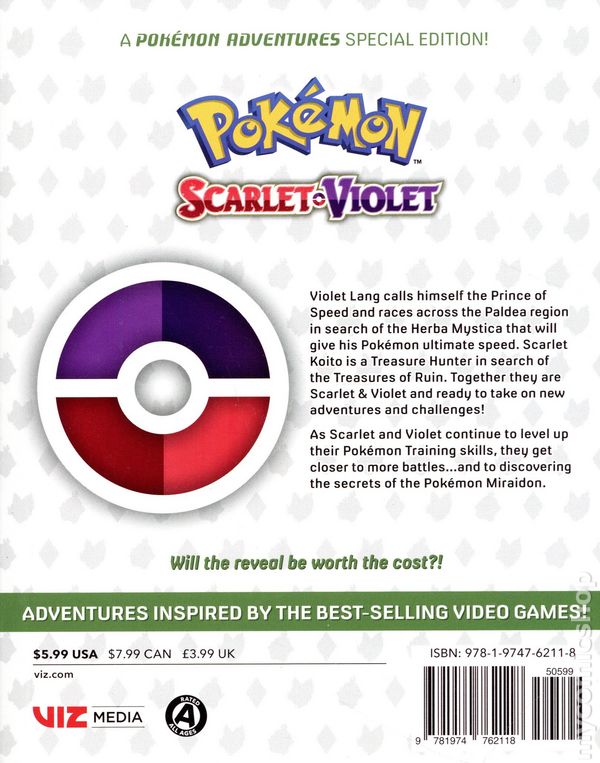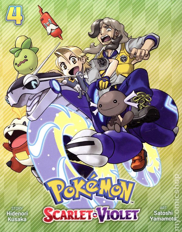 Volume 4 - 1st printing. Written by Hidenori Kusaka. Art and cover by Satoshi Yamamoto. Translated by Tetsuichiro Miyaki. Adapted by Molly Tanzer. As Scarlet and Violet continue to level up their Pokémon Training skills, they get closer to more battles…and to discovering the secrets of the Pokémon Miraidon. Will the reveal be worth the cost?! Softcover, 5 1/2-in. x 7-in., 96 pages, B&W. All Ages Cover price $5.99.