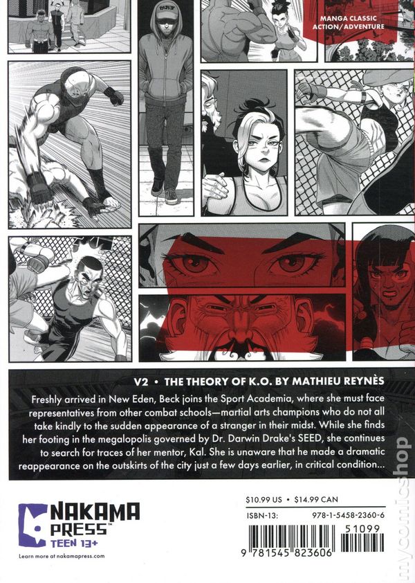 Volume 2 - 1st printing. Story and art by Mathieu Reynes. Translated by Book Buddy Media. Freshly arrived in New Eden, Beck joins the Sport Academia, where she must face representatives from other combat schools-- martial arts champions who do not all take kindly to the sudden appearance of a stranger in their midst. While she finds her footing in the megalopolis governed by Dr. Darwin Drake's SEED, she continues to search for traces of her mentor, Kal. She is unaware that he made a dramatic reappearance on the outskirts of the city just a few days earlier, in critical condition... Softcover, 5-in. x 7-in., 200 pages, B&W. Young Adult Cover price $10.99.