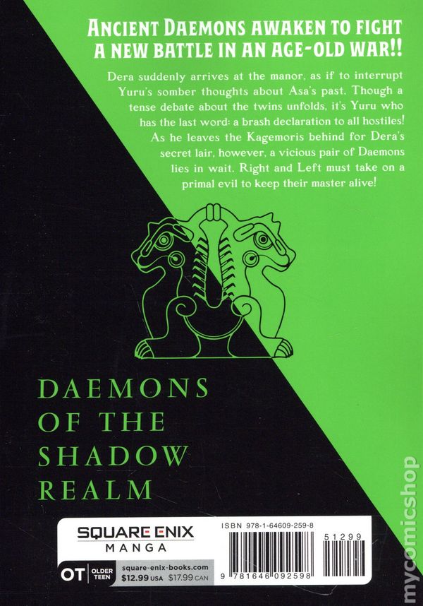 Volume 4 - 2nd and later printings. Story and art by Hiromu Arakawa. Translated by Amanda Haley. In a world where certain humans command mighty supernatural duos called Daemons, it is the birthright of "the children who sunder day and night"-twins Yuru and Asa-to rule over these powerful entities. Yuru's somber thoughts about Asa's past are broken by Dera, who suddenly arrives at the manor. Though a tense debate about the twins unfolds, it's Yuru who has the last word: a brash declaration to all hostiles! As he leaves the Kagemoris behind for Dera's secret lair, however, a vicious pair of Daemons lies in wait. Left and Right must take on a primal evil to keep their master alive! Softcover, 5-in.x 7-in., 176 pages, B&W. Older Teen Cover price $12.99.