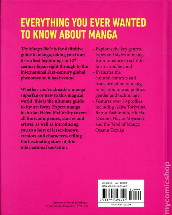 1st printing. By Helen McCarthy. This artful and authoritative guide charts mangas rise from historical narrative scrolls to its position as an international creative powerhouse that has changed the way books are read. Renowned manga historian Helen McCarthy delivers the ultimate resource for anyone curious about the art forms past, present, and future. Spanning from 11th-century illustrated scrolls to todays billion-dollar industry and global fandoms, The Manga Bible explores mangas origins, its narrative and aesthetic evolution, and its wide-reaching influence on visual storytelling around the world. Organized thematically, the book examines major movements, genres, and milestones—from censorship and subversion in postwar Japan to the rise of science fiction, the role of erotic manga, and the cultural dynamics of gendered readerships. McCarthy also considers mangas deep connections with film, television, fashion, and music, and introduces both globally recognized artists and lesser-known creators whose contributions deserve greater visibility. Featuring hundreds of images—manga pages, historical prints, vintage covers, and fan ephemera—the volume offers a dynamic visual companion to its nuanced analysis. McCarthys writing is vivid and incisive, revealing how manga has functioned as both entertainment and a medium for symbolism, politics, and social reflection. Rooted in scholarship yet written with accessibility and energy, The Manga Bible presents a comprehensive portrait of manga as one of the worlds most influential and complex storytelling traditions. It captures the scope of its artistic innovations, the passion of its global communities, and the forces—both underground and mainstream—that continue to shape its enduring appeal. Hardcover, 6 1/2-in. x 8-in., 320 pages, full color. Cover price $29.99.