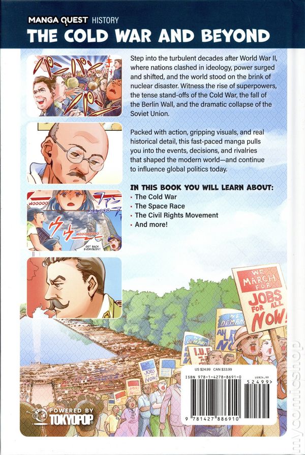 1st printing. Written by Hidehisa Nanbo. Art and cover by Hidehisa Nanbo. Translated by Tokyo Otaku Mode (TOM) and David Bove. A dynamic, full-color manga that brings the Cold War era and modern history to life! Dive into the global tensions, pivotal events, and influential figures that shaped the world during and after the Cold War, all through engaging storytelling and vivid illustrations. Explore the twists and turns of global history in this action-packed manga that takes readers from the aftermath of World War II through the Cold War—and beyond. Follow the rise of superpowers, the nuclear arms race, the fall of the Berlin Wall, and the shifting world order that followed the Soviet Unions collapse. Along the way, discover how powerful movements for civil rights and human dignity—from the struggle for racial equality in the United States to broader global human rights activism—challenged societies to live up to their ideals during this tense era. This vivid historical adventure weaves together dramatic storytelling with real-world context, helping readers understand the forces that continue to shape international relations today. This book also includes rich nonfiction content featuring real photographs, historical timelines, political maps, and key facts that connect manga moments to actual events. Its the perfect blend of compelling narrative and educational depth—ideal. Softcover, 6-in. x 9-in., 184 pages, full color. Age 10 and up Cover price $19.99.