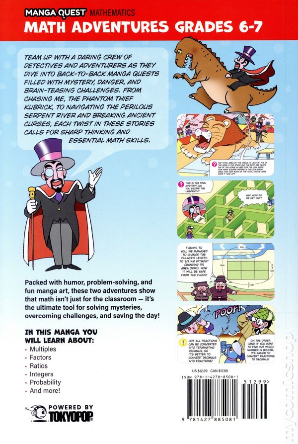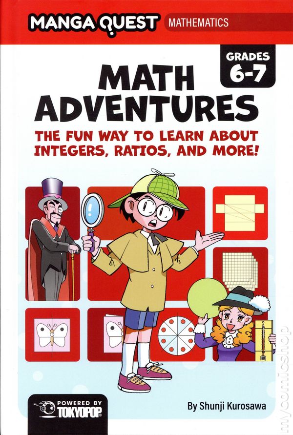 1st printing. Written by Shunji Kurosawa. Art and cover by Toru Hasabe. Translated by Tokyo Otaku Mode (TOM) and David Bove. An exciting full-color manga where mystery meets mathematics! Join a young detective and a set of adventurers as they crack codes, chase thieves, and solve real math challenges using logic and bravery. Join master detective Rock Yodogawa, his fearless partner June, and their companions—Liu, Mutsuki, and eccentric Professor Hex—in two back-to-back manga adventures bursting with mystery, danger, and brain-teasing challenges. From chasing the elusive Phantom Thief Kubrick to navigating the perilous Serpent River and breaking ancient curses, every twist demands sharp thinking and essential math skills. Filled with humor, logic, and a sense of inquiry, Math Adventures for Grades 6–7 combines exciting storytelling with educational learning. Readers will gain math confidence and have fun doing it—because in this world, math isnt just a subject, its the secret to every mystery! Softcover, 6-in. x 9-in., 184 pages, full color. Grade 5 & Up Cover price $12.99.