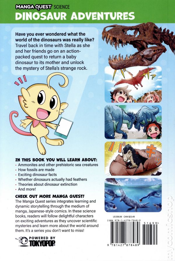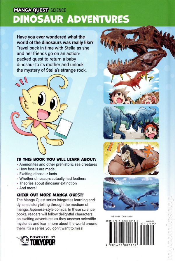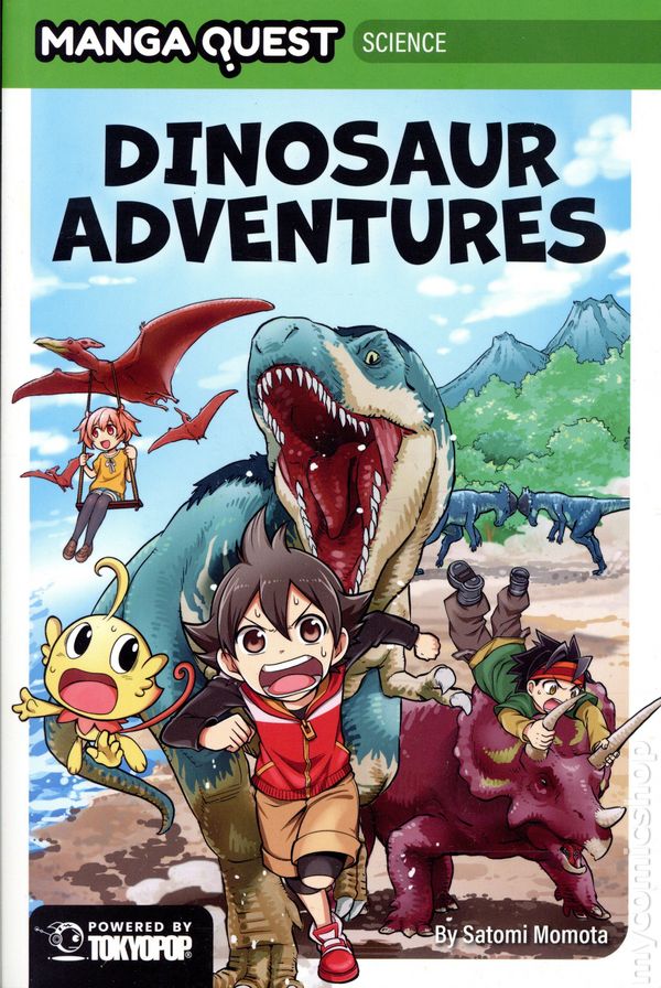 1st printing. Story and art by Satomi Momota. Translated by Tokyo Otaku Mode (TOM) and David Bove. A thrilling, full-color science manga that blends time-travel adventure with real facts about dinosaurs! Follow curious kids and a space explorer named Stella as they journey back in time through the Cretaceous period to uncover the world of dinosaurs. This book is guided by expert science consultants and packed with dino-sized fun.When a mysterious stone falls from the sky, Riku is swept into a wild, time-traveling adventure with Stella, an alien explorer, and a crew of his classmates. Armed with a magical Quest Book, they travel back to the age of dinosaurs—diving deep into prehistoric oceans, encountering towering sauropods, and even hatching a dinosaur egg! With real science woven into every chapter and sidebars that explain the fascinating world of paleontology, Dinosaur Adventures is both an edge-of-your-seat manga journey and a crash course in dinosaur discovery. Hardcover, 6-in. x 9-in., 176 pages, full color. Grade 5 & Up Cover price $19.99.