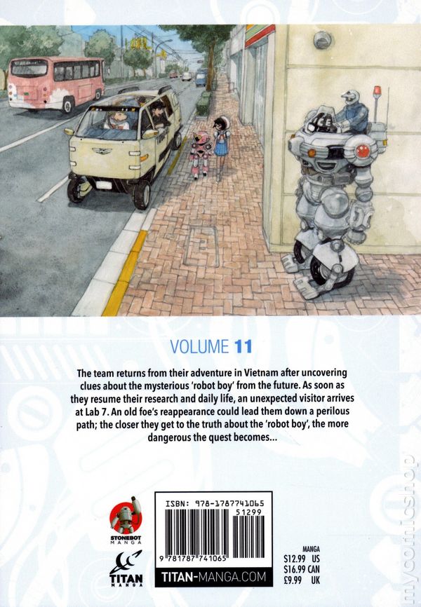 Volume 11 - 1st printing. Based on the Original Idea by Osamu Tezuka. Concept by Masami Yuuki. Art and cover by Tetsuro Kasahara. Translated by Jonathan Clements. THE ELEVENTH VOLUME OF ATOM: THE BEGINNING MARKS THE TEAMS RETURN FROM THEIR ADVENTURES IN VIETNAM, WHERE THEY WERE ABLE TO UNCOVER CLUES ABOUT THE ROBOT BOY FROM THE FUTURE. They have the chance to ponder the various pieces of information they gathered, whilst resuming their research and daily life. But before everything can become completely normal again, an unexpected visitor disrupts the harmony! Softcover, 5-in. x 7-in., 224 pages, B&W. Cover price $12.99.