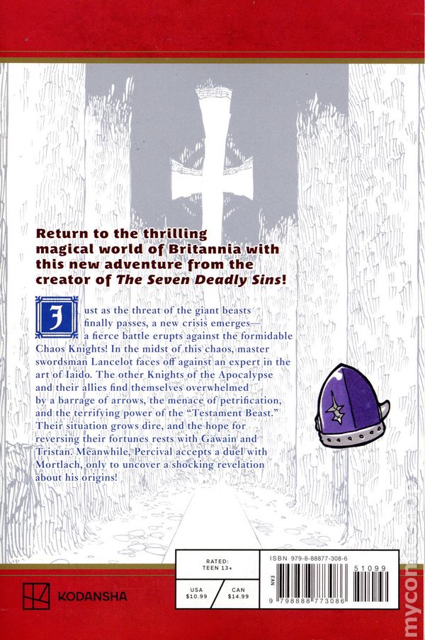 Volume 19 - 1st printing. Story and art by Nakaba Suzuki. Translated by Kevin Steinach. Return to the magical and thrilling world of Britannia with this new adventure from the creator of The Seven Deadly Sins, the manga that inspired the No. 1 hit Netflix Original Anime! Percival has always lived with his grandfather on the idyllic, remote God's Finger. And though Percival loves the simple life, he longs for adventure. That is, until adventure comes knocking at his door, tearing away everything he's ever known and leaving him alone in the world. Now Percival has no choice but to go out into the world and see what it holds... after all, it's his destiny! Four Knights of the Apocalypse is a new story in the world of The Seven Deadly Sins, but can be enjoyed totally on its own! Softcover, 5-in. x 7-in., 192 pages, B&W. Teen (13+) Cover price $10.99.