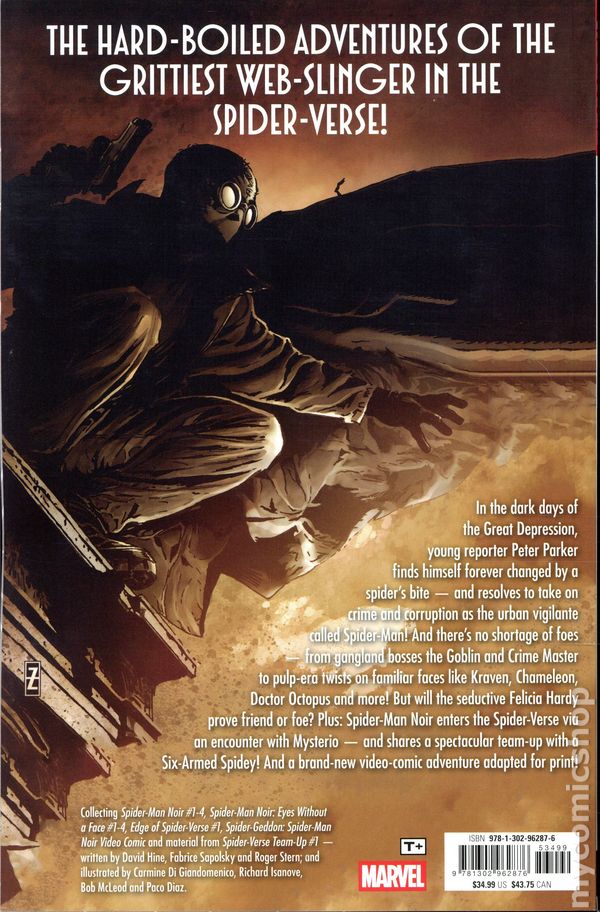 1st printing. Collects Spider-Man Noir (2009) #1-4, Spider-Man Noir: Eyes Without a Face (2009) #1-4, Edge of Spider-Verse (2014 Marvel) #1, Spider-Geddon: Spider-Man Noir Video Comic (2018) 1, material from Spider-Verse Team Up (2014) #1. Written by David Hine, Fabrice Sapolsky, and Roger Stern. Art by Carmine Giandomenico, Richard Isanove, Bob McLeod, Tim Eldred, and Paco Diaz. Cover by Patch Zircher. The hard-boiled adventures of the grittiest web-slinger in the Spider-Verse! In the dark days of the Great Depression, young reporter Peter Parker finds himself forever changed by a spider's bite - and resolves to take on crime and corruption as the urban vigilante called Spider-Man! And there are no shortage of foes - from gangland bosses the Goblin and Crime Master to pulp-era twists on familiar faces like Kraven, Chameleon, Doctor Octopus and more! But will the seductive Felicia Hardy prove friend or foe? Plus: Spider-Man Noir enters the Spider-Verse via an encounter with Mysterio - and shares a spectacular team-up with a six-armed Spidey! Softcover, 264 pages, full color. Rated T+ Cover price $34.99.